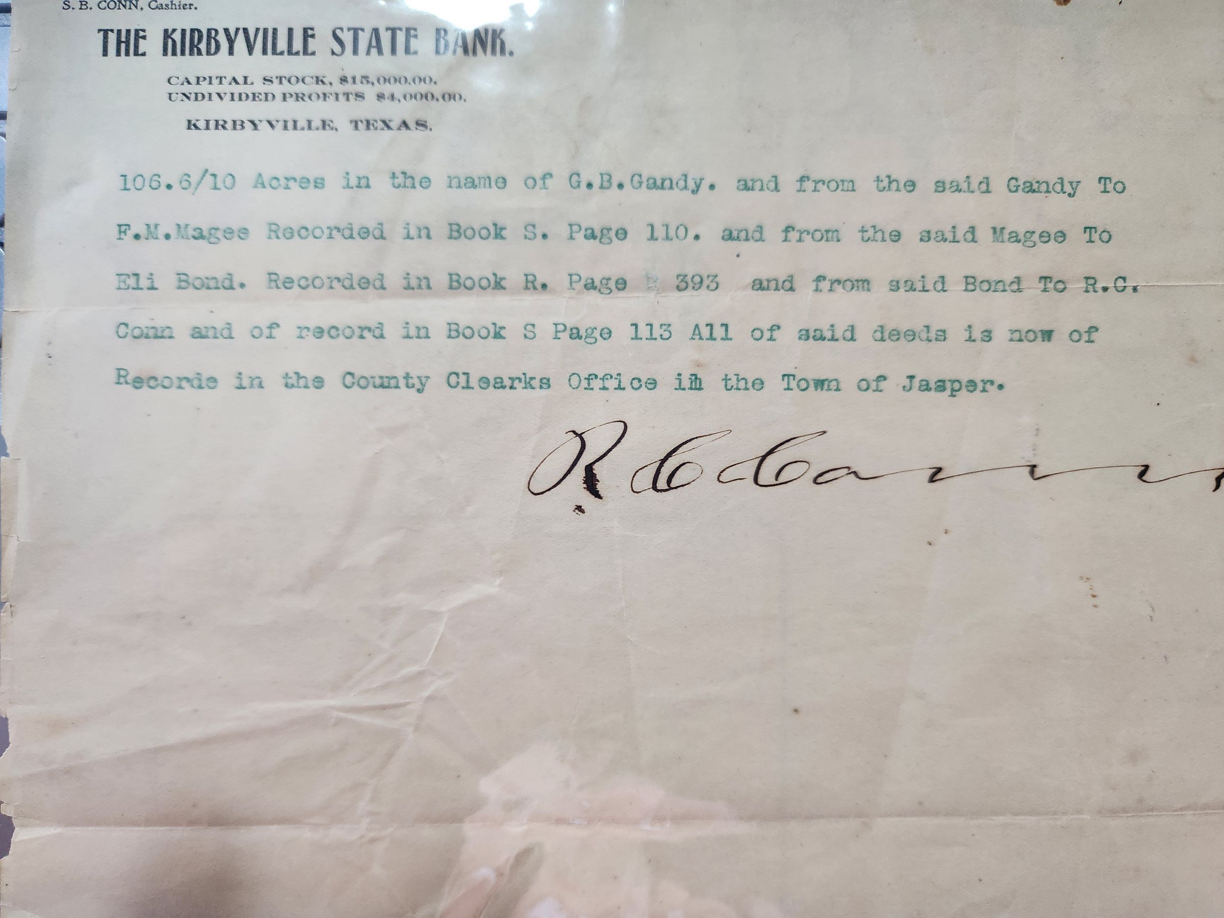 Kirbyville State Bank Note listing Deeds now recorded in the Clerks Office of Town of JasperTags
