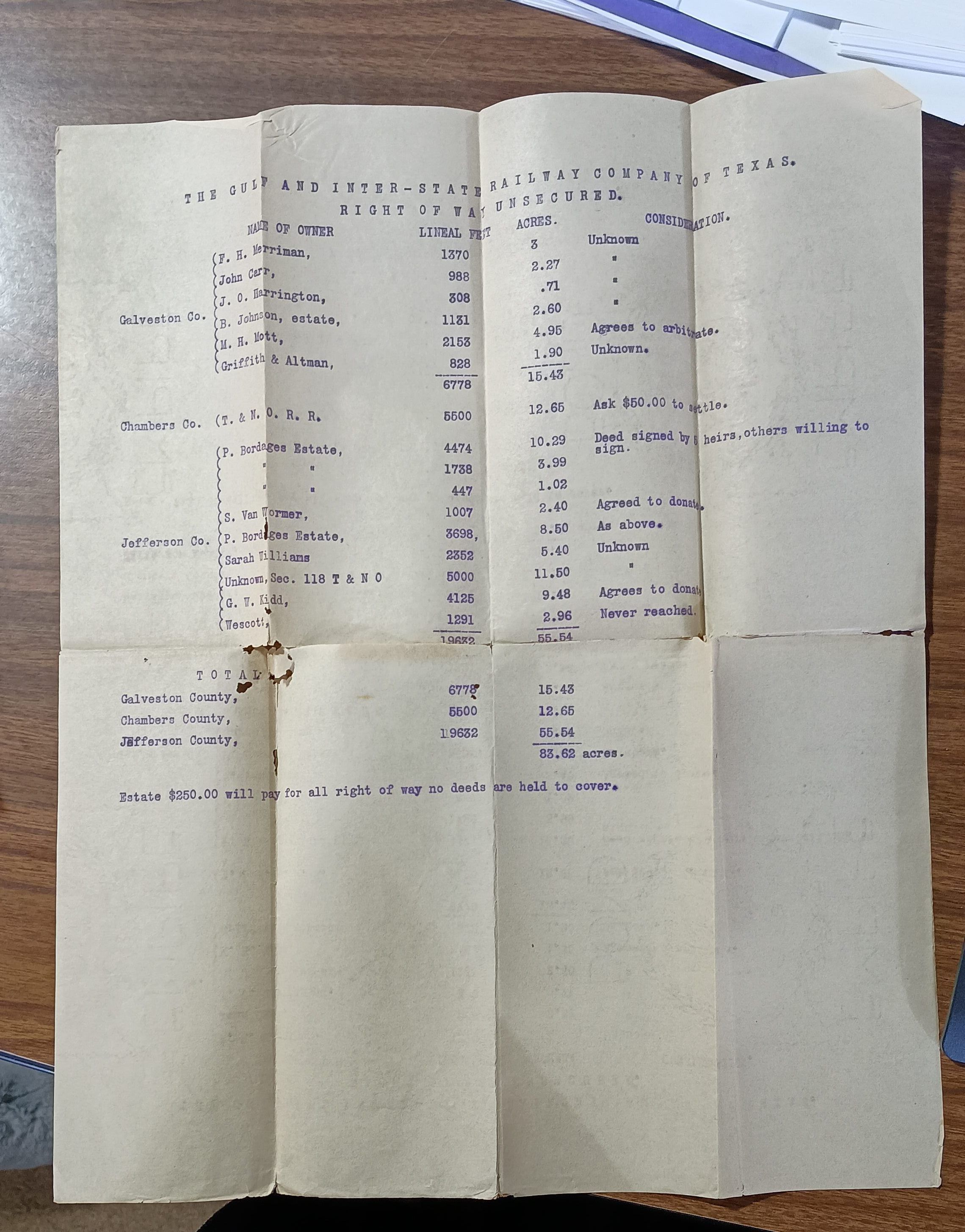 Ledger sheet from The Gulf and Inter-state Railway Company of Texas, Right of Way Unsecured - undatedTags