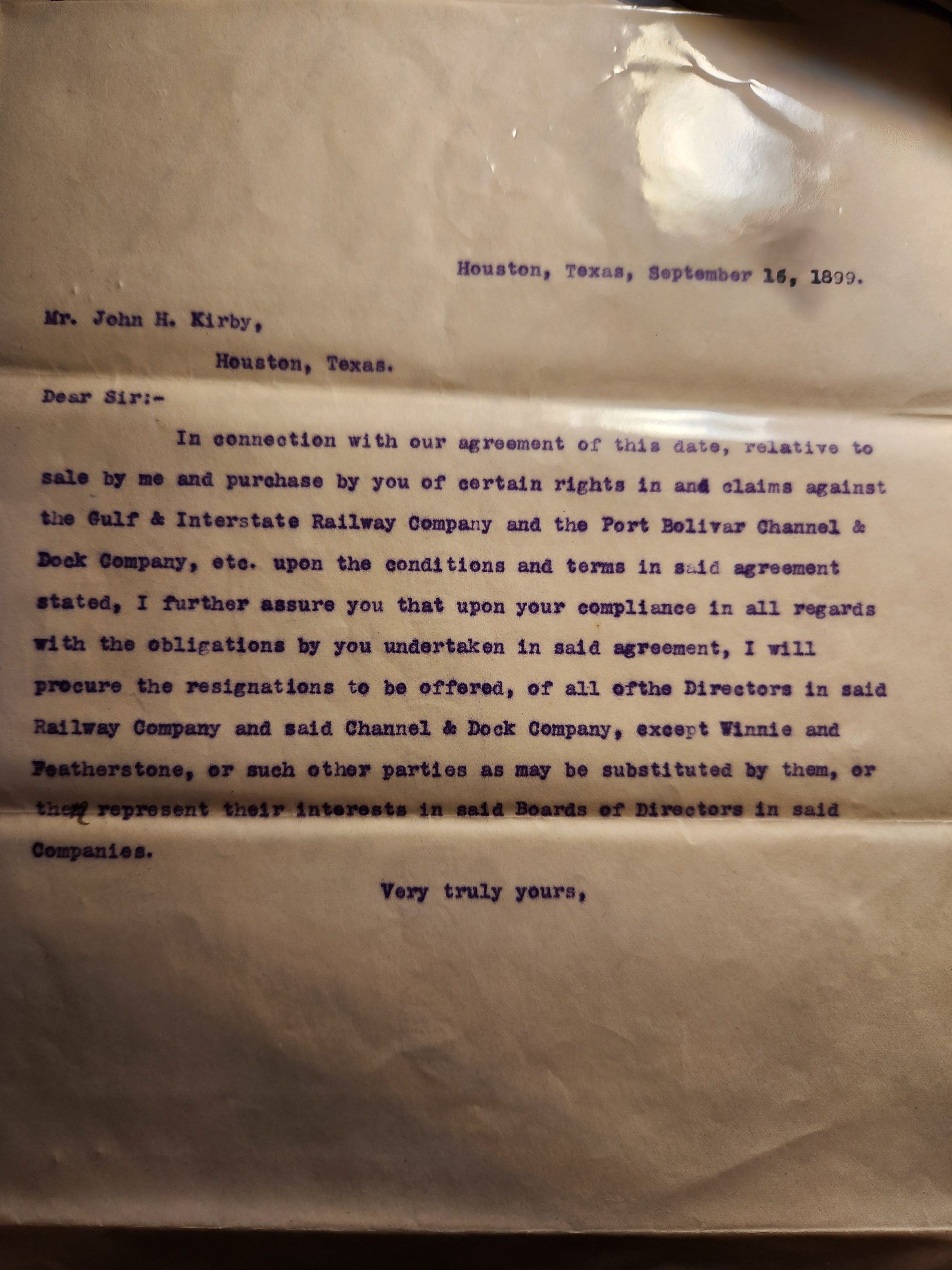 Letter from A H Pierce to John Henry Kirby dated September 16, 1899 concerning Gulf & Interstate Railway Co and Port Bolivar Channel & Dock CoTags