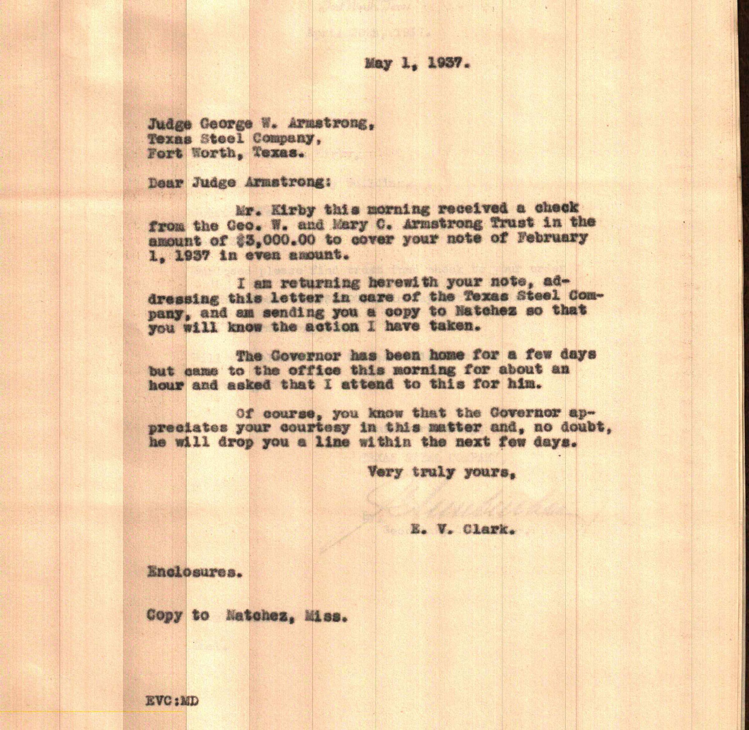 Letter from E V Clark to George W Armstrong dated May 1,197Tags