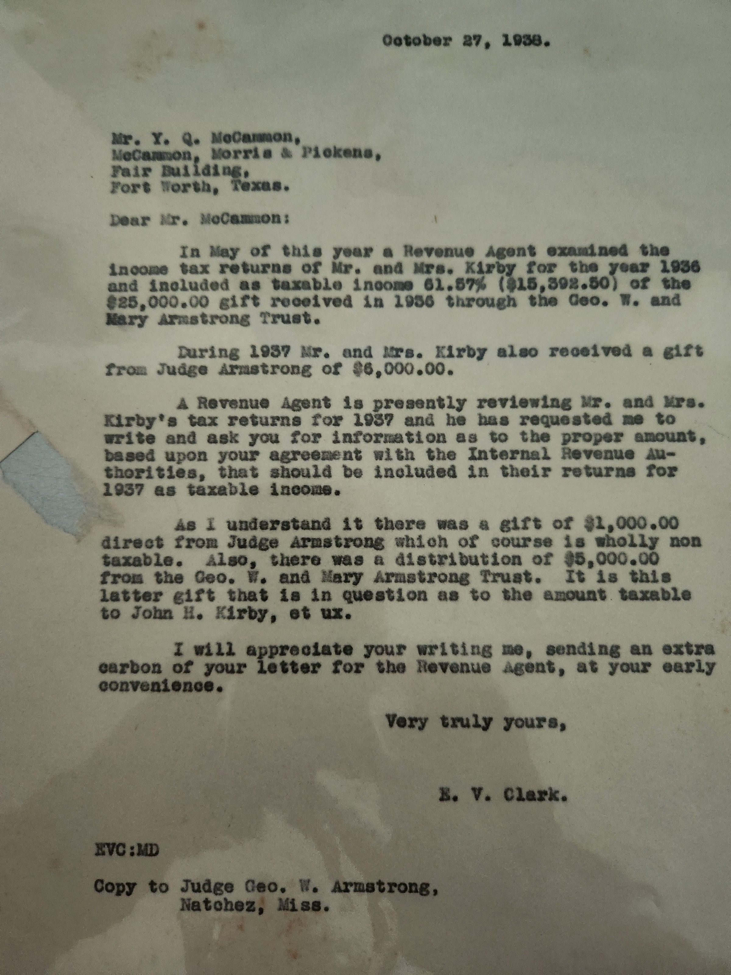 Letter from E V Clark to Y G McCammon Dated October 27, 1938 concerning taxable income for 1937Tags