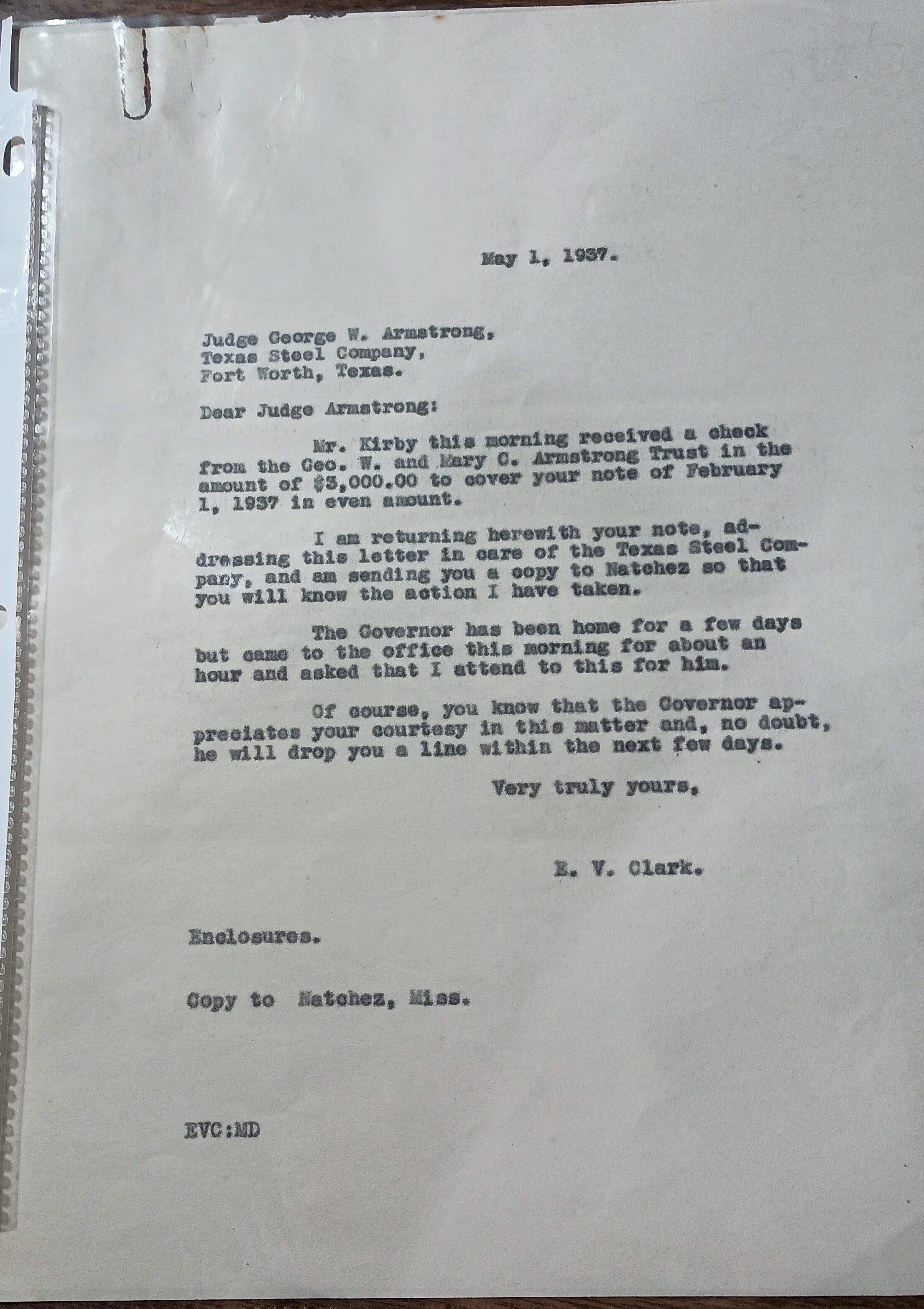 Letter from E.V. Clark (Kirby Lumber Co.) to Judge George W. Armstrong, Texas Steel Company dated May 1, 1937 discussing a check from Armstrong Trust for $3,000.00 for February 1, 1937 payment in even amountTags