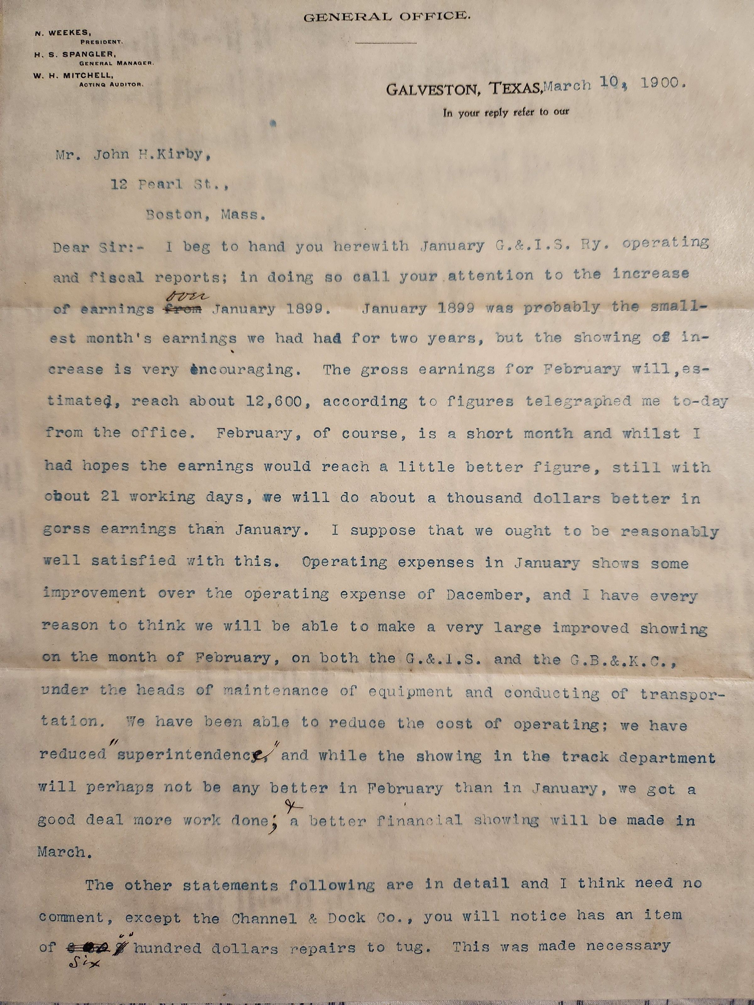 Letter from H B Spangler of Gulf & Inter State R'Y Co to John Henry Kirby dated March 10, 1900 concerning operating and fiscal reportsTags