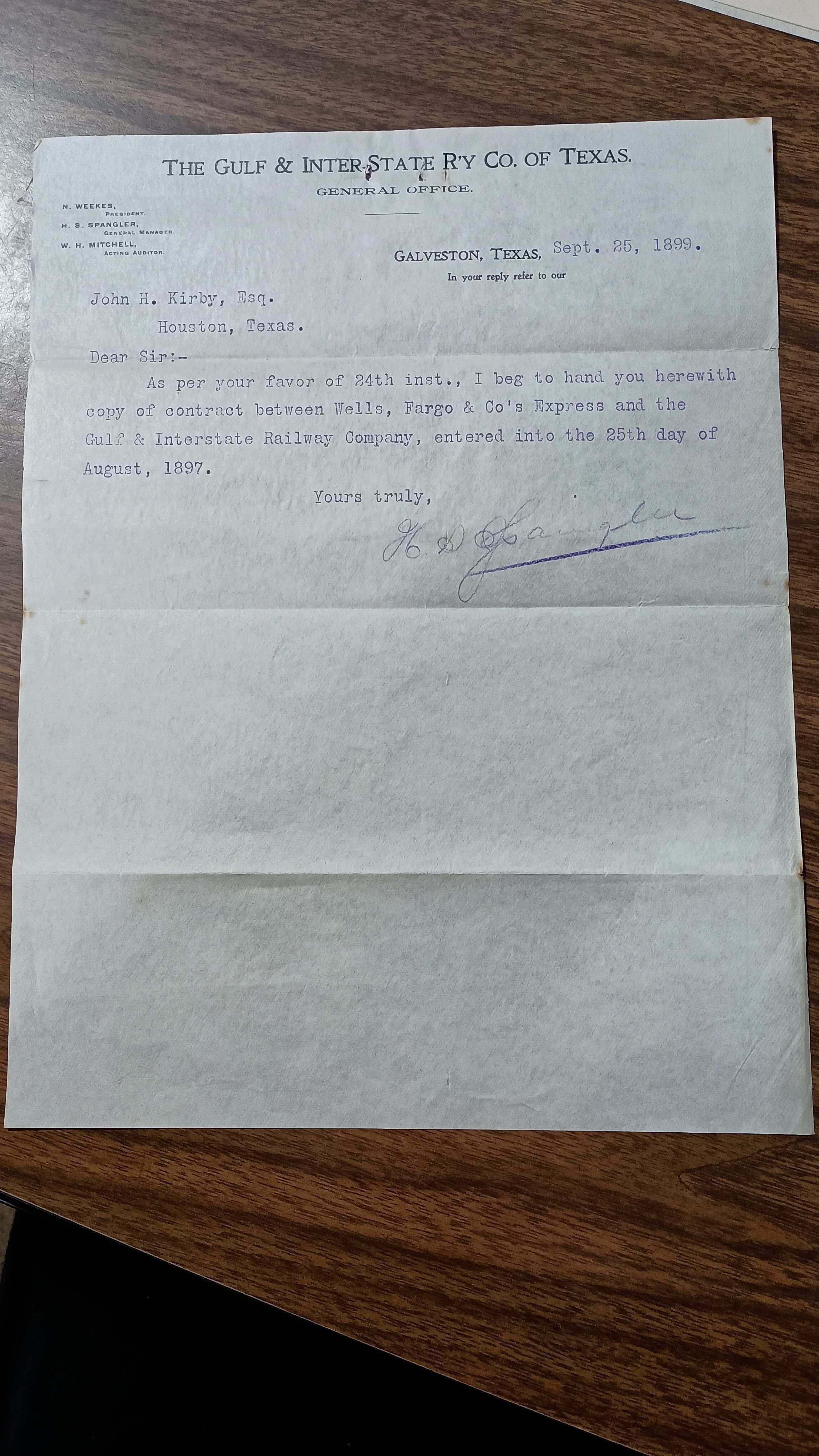 Letter from H. S. Spangler with The Gulf & Inter State Railway Co of Texas to John Henry Kirby dated September 25, 1899 transmitting a copy of Contract between Well, Fargo & Co's Express and the Gulf Interstate Railway Company entered into August 25, 1897Created By