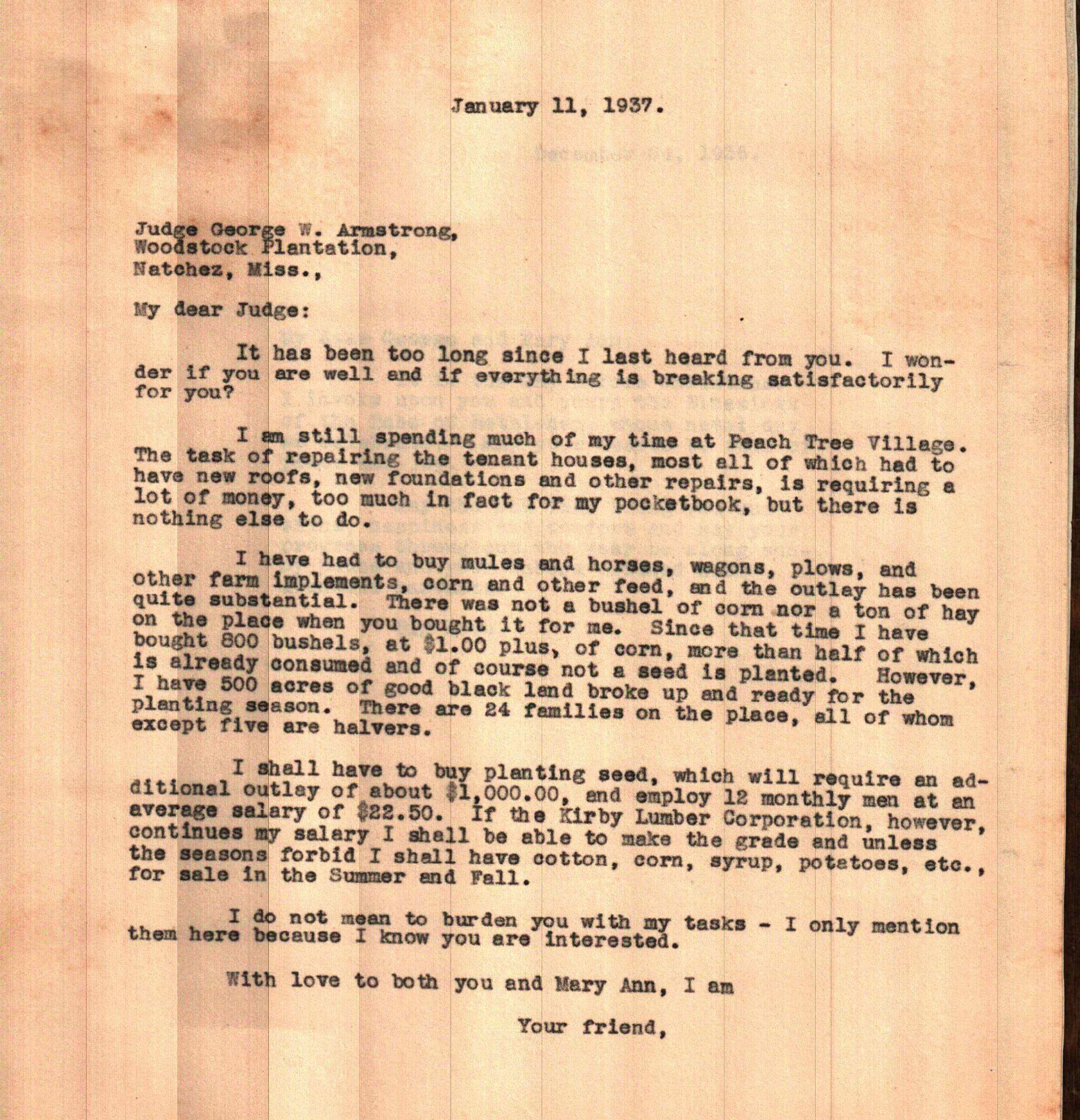 Letter from John Henry Kirby to George W Armstrong dated January 11, 1937 concerning repairs at Peach Tree VillageTags