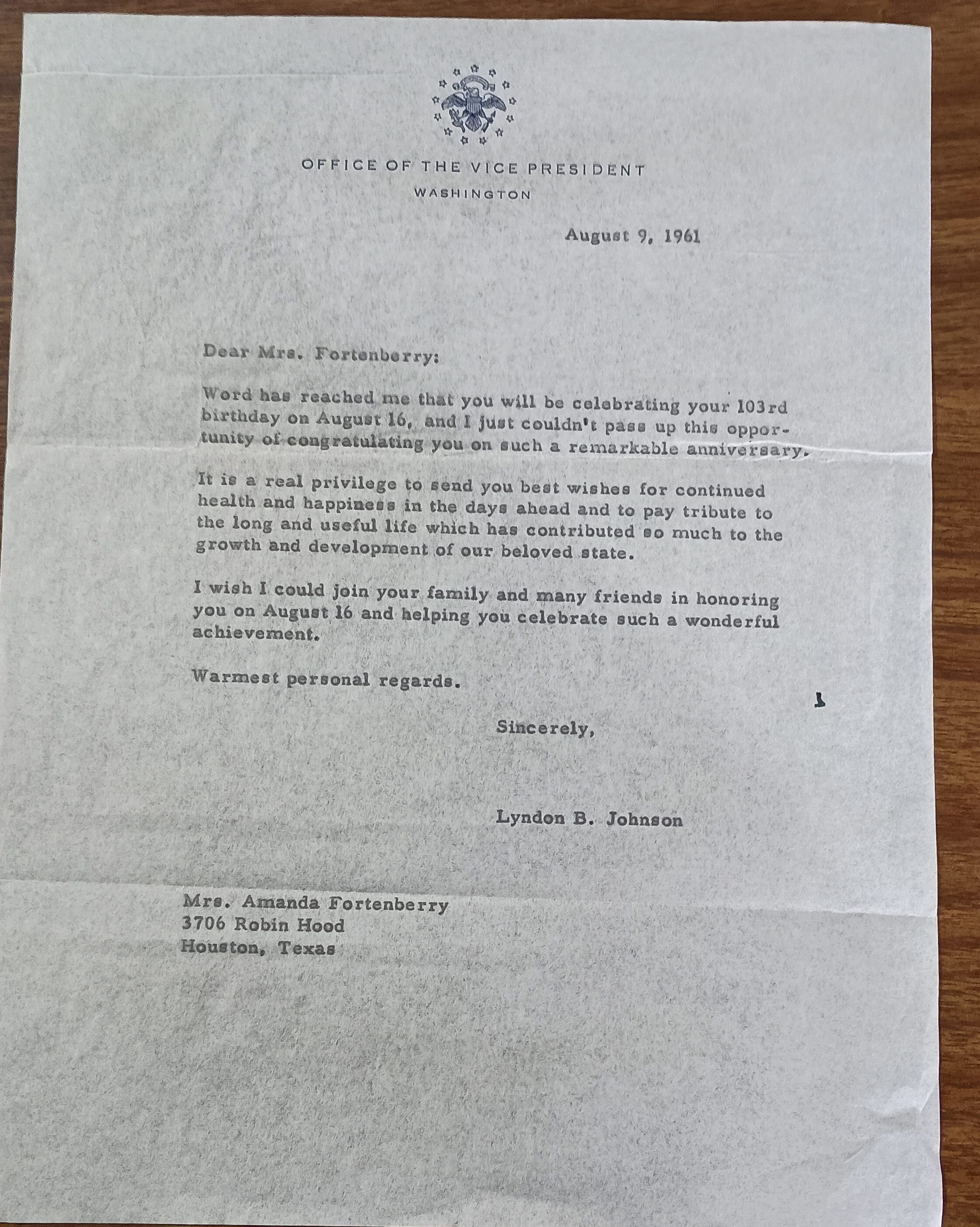Letter to Mrs Amanda Fortenberry from Lyndon B Johnson, Office of the Vice President dated August 9, 1961 congratulating her on her 103rd birthday on August 16Created By