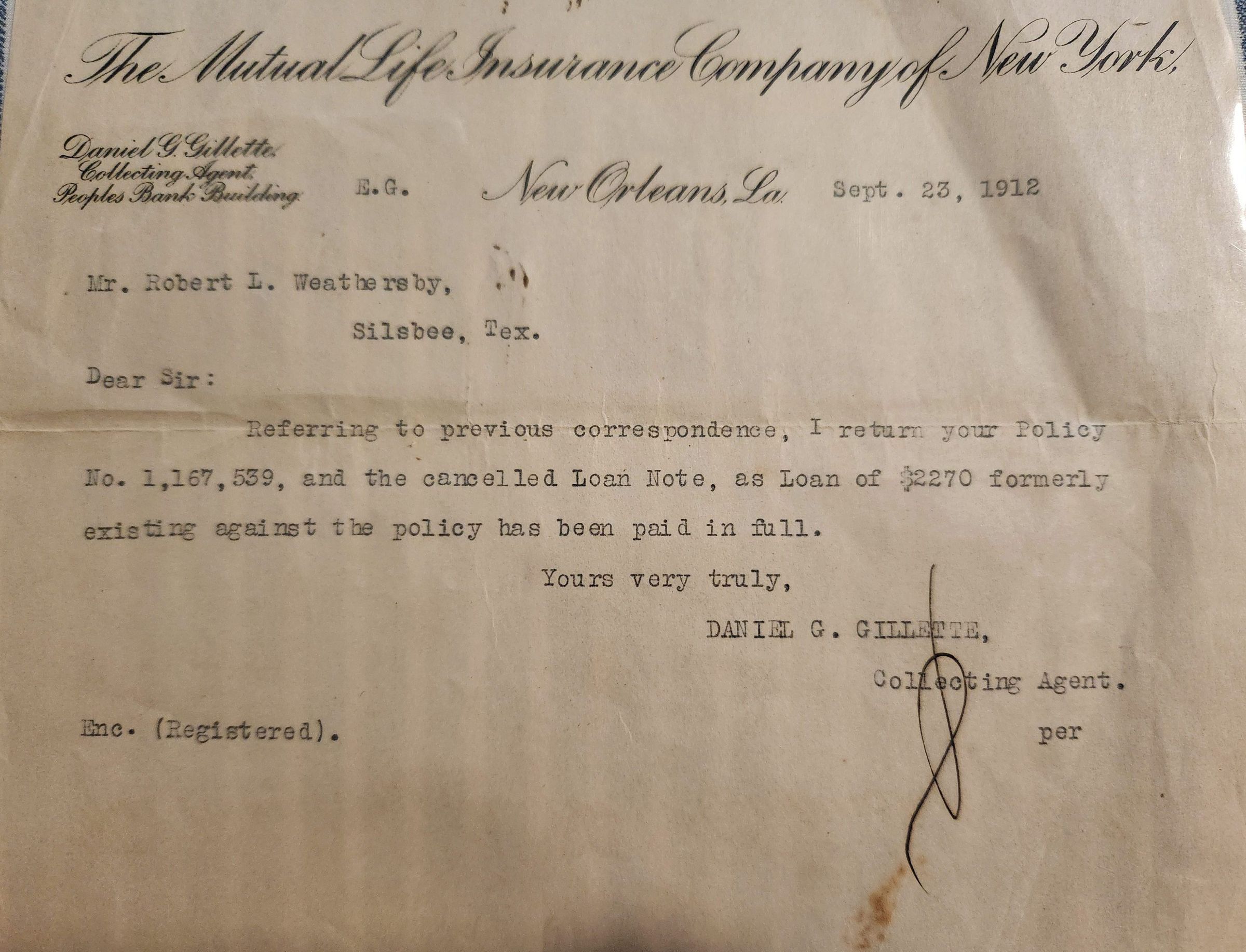 Letter from Mutual Life Insurance Co of NY to Robert L Weathersby dated September 22, 1912 - loan against this policy for $2270 paid in fullTags