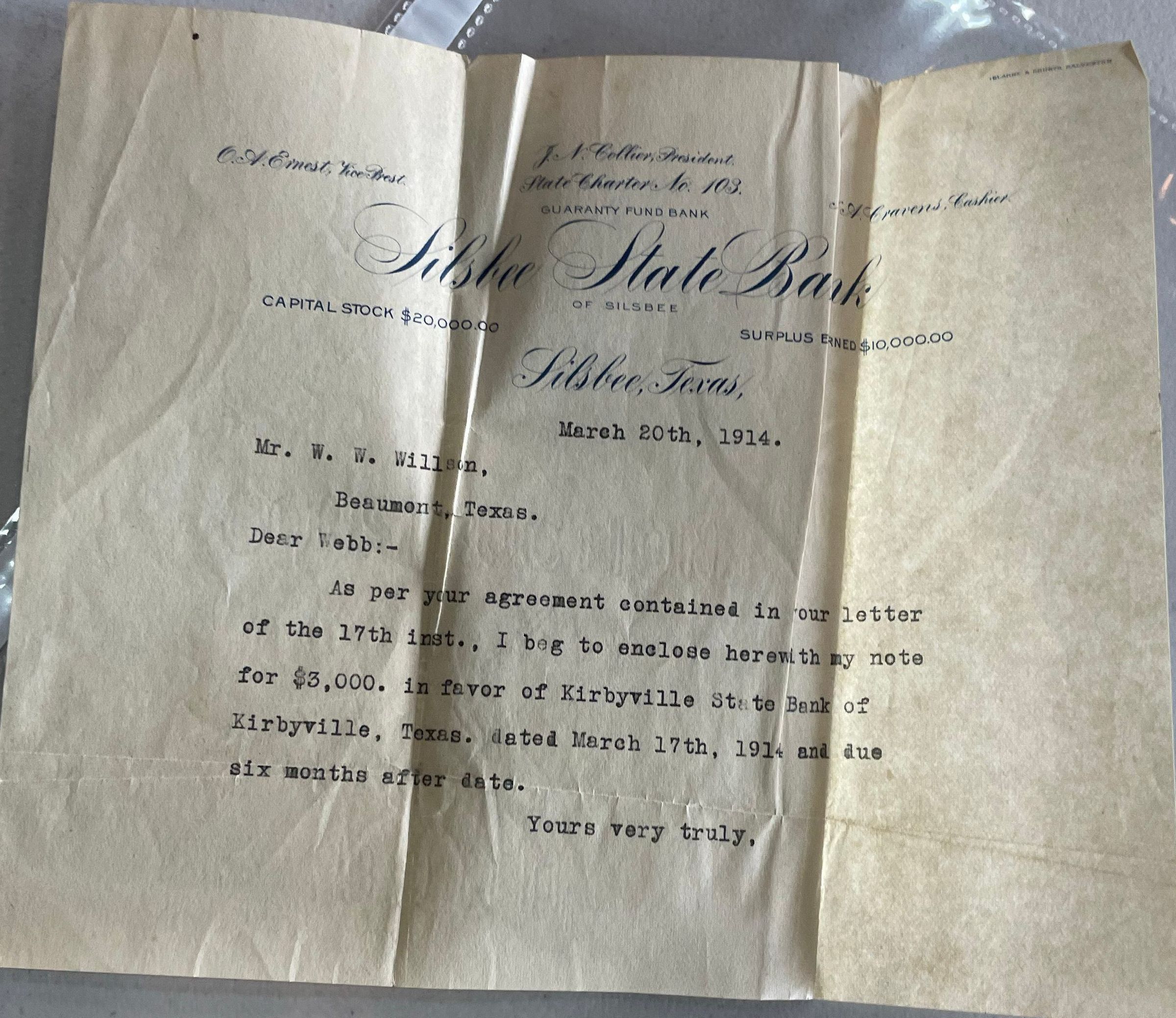 Letter from Silsbee State Bank to W W Wilson dated March 20, 1914Tags