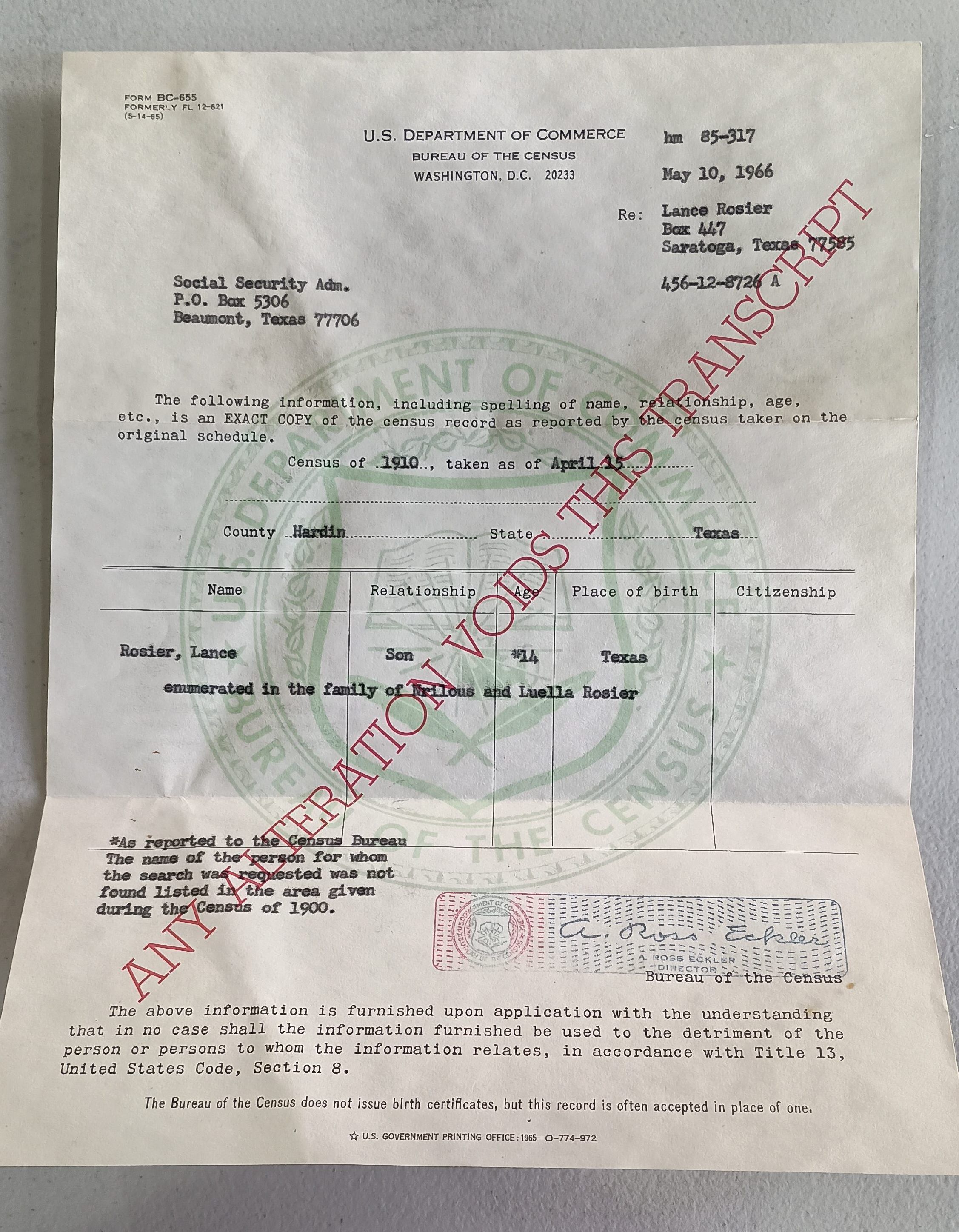 Letter from US Department of Commerce to Social Security Administration dated May 10, 1966 regarding Lance Rosier regarding the 1910 censusTags