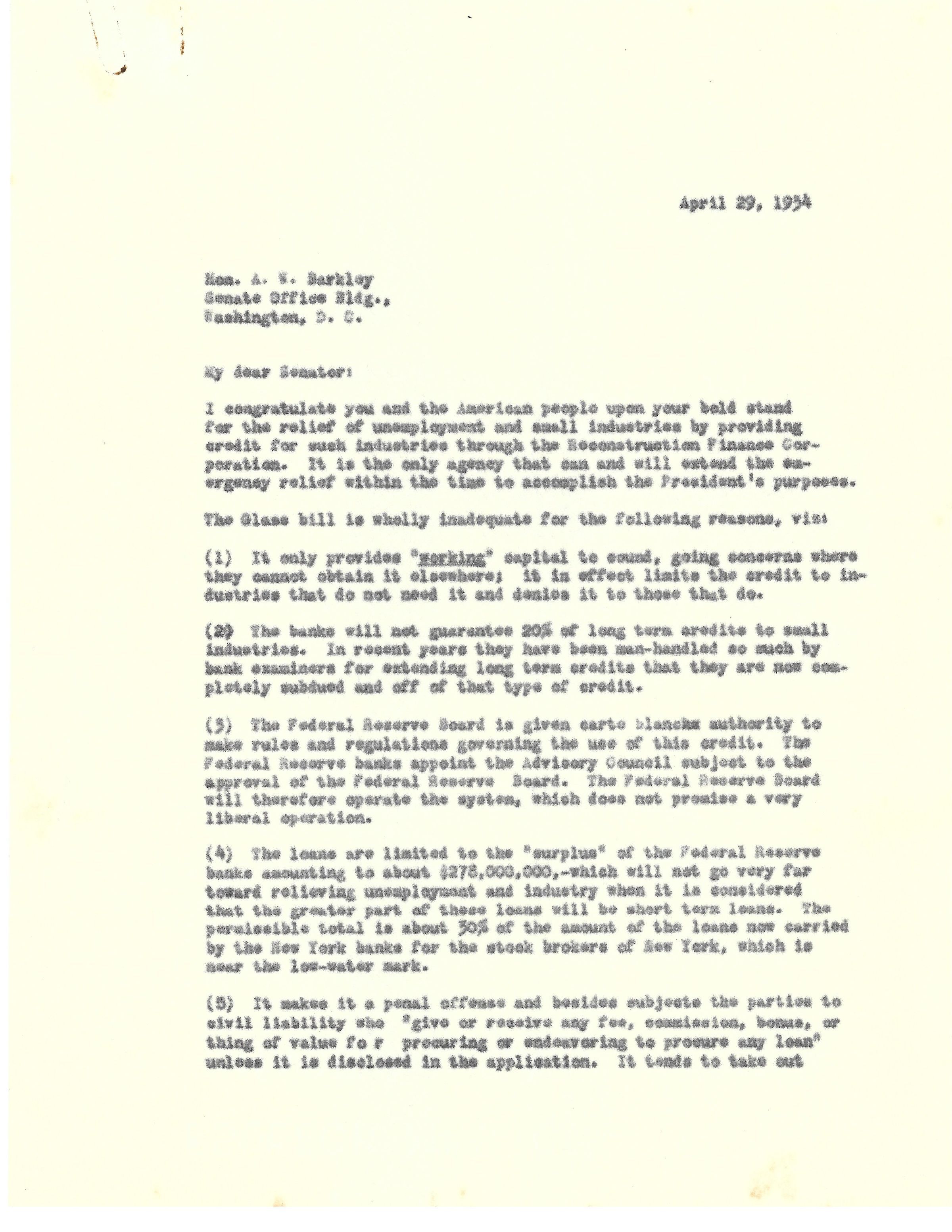 Letter to A W Barkley from George W Armstrong dated April 27, 1934Tags