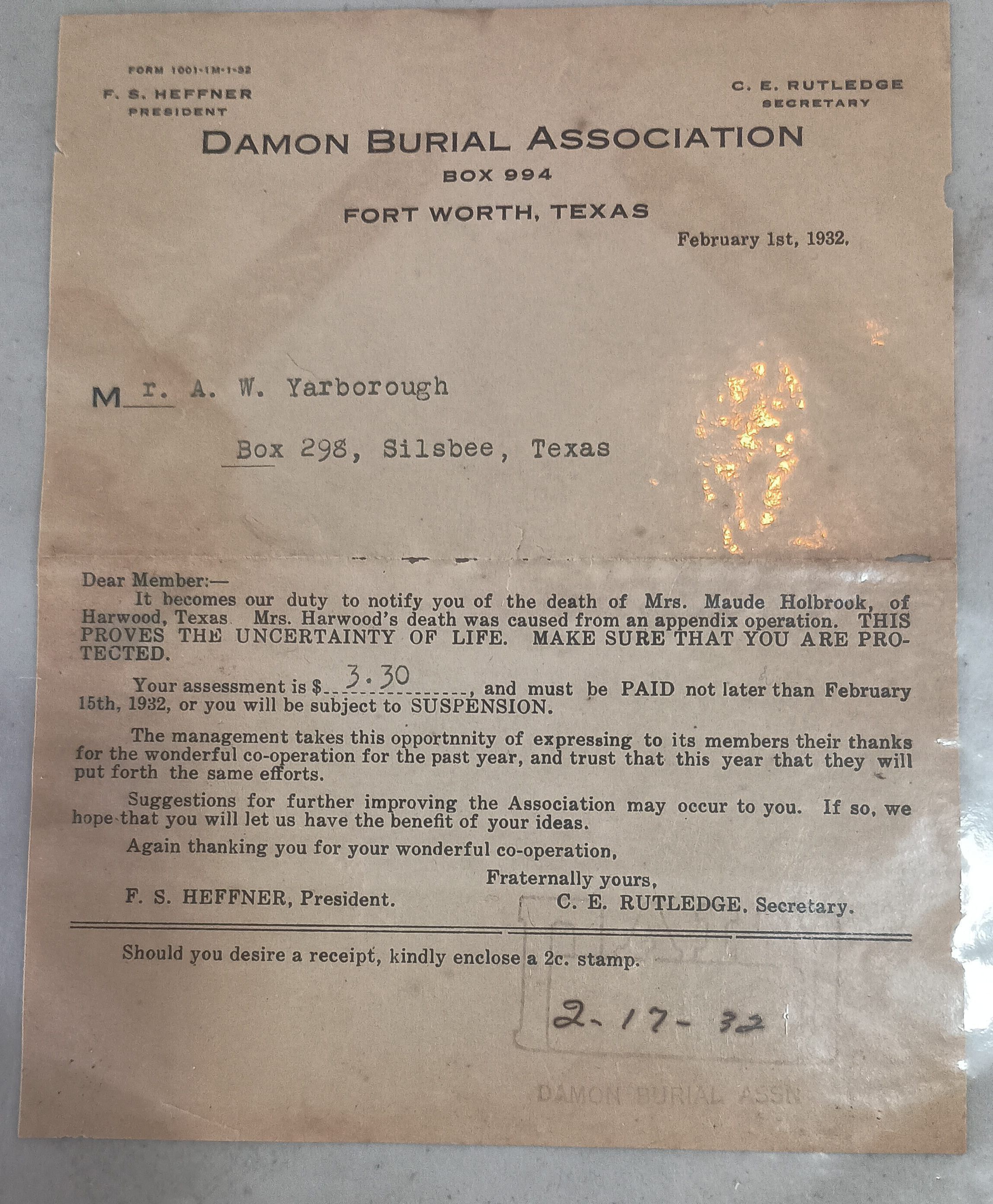Letter to AW Armstrong dated February 1, 1932 from Damian Burial Association regarding the death of Mrs. Maude HolbrookTags