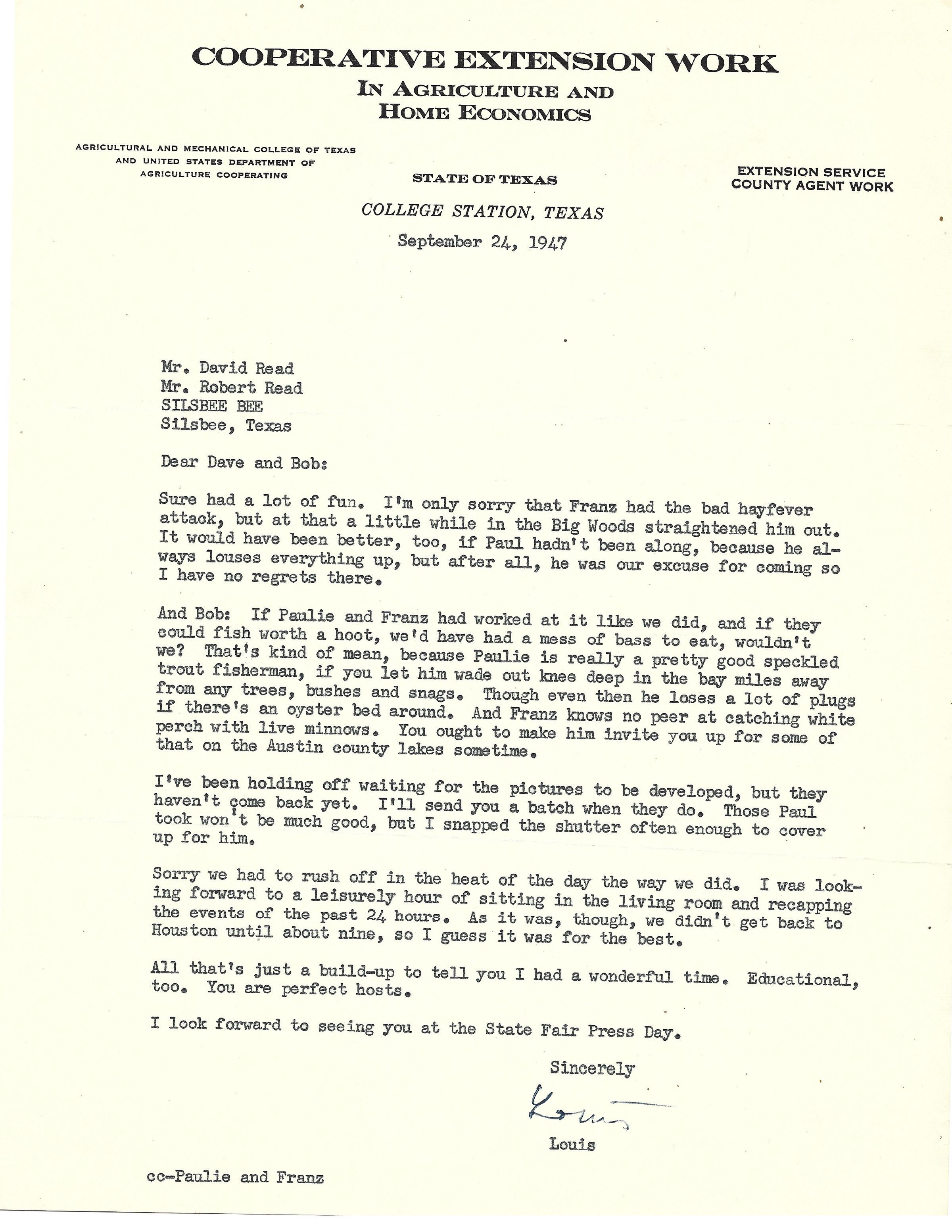 Letter to David and Bob Read from Louis Franke September 24, 1947Tags