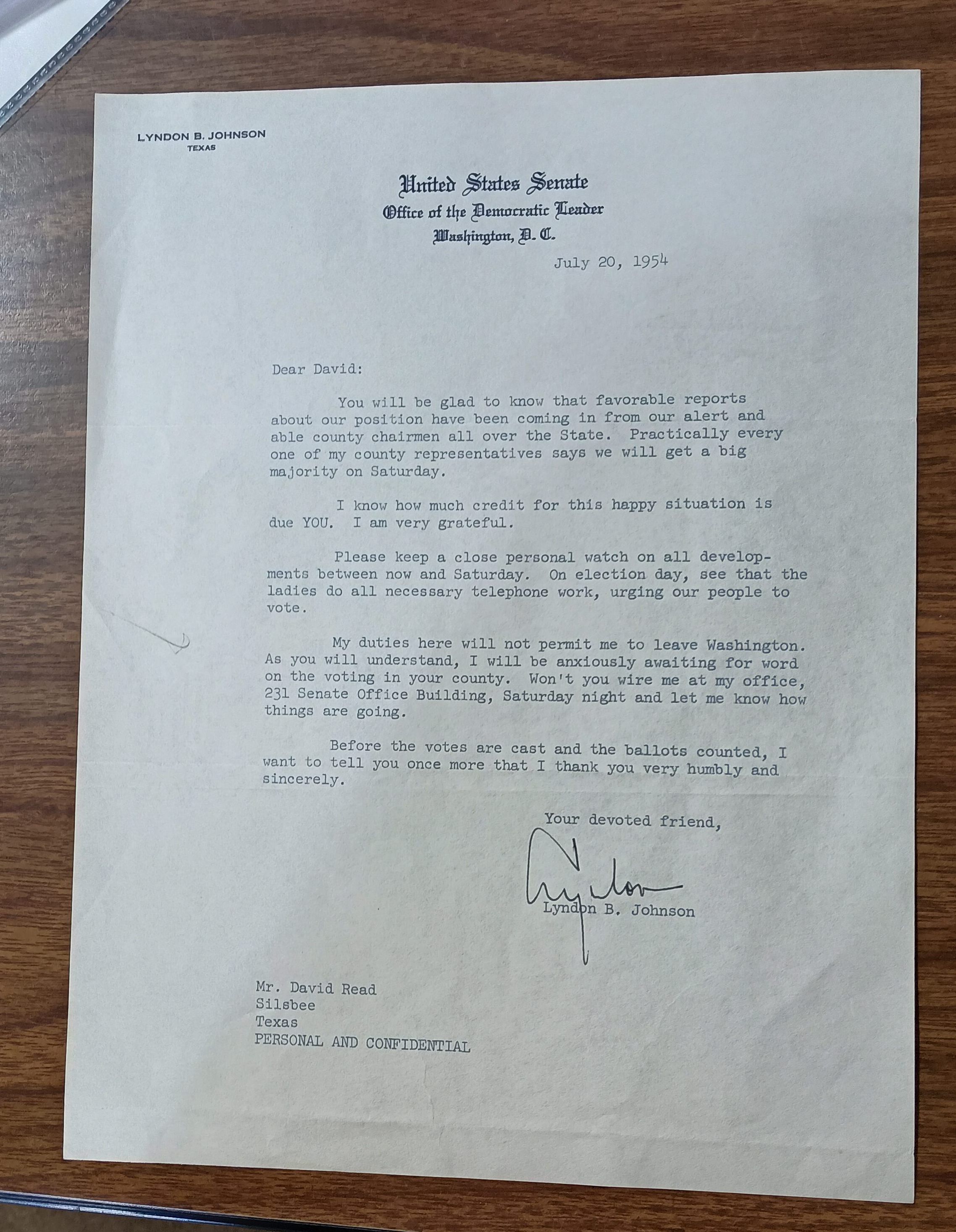 Letter to David Read dated July 20, 1954 from Lyndon B Johnson while in the US SenateTags