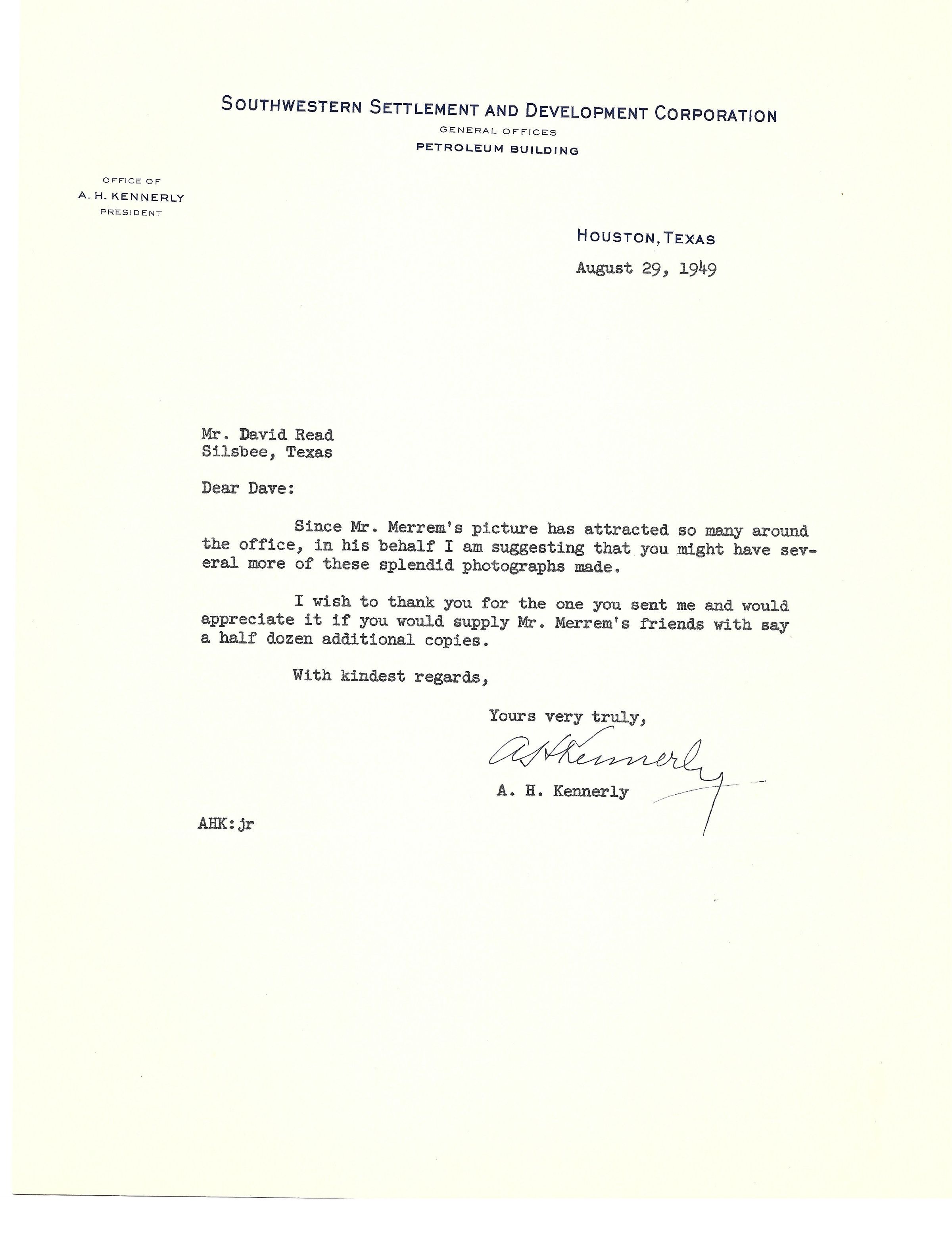 Letter to David Read from A H Kennerly August 29, 1949Tags