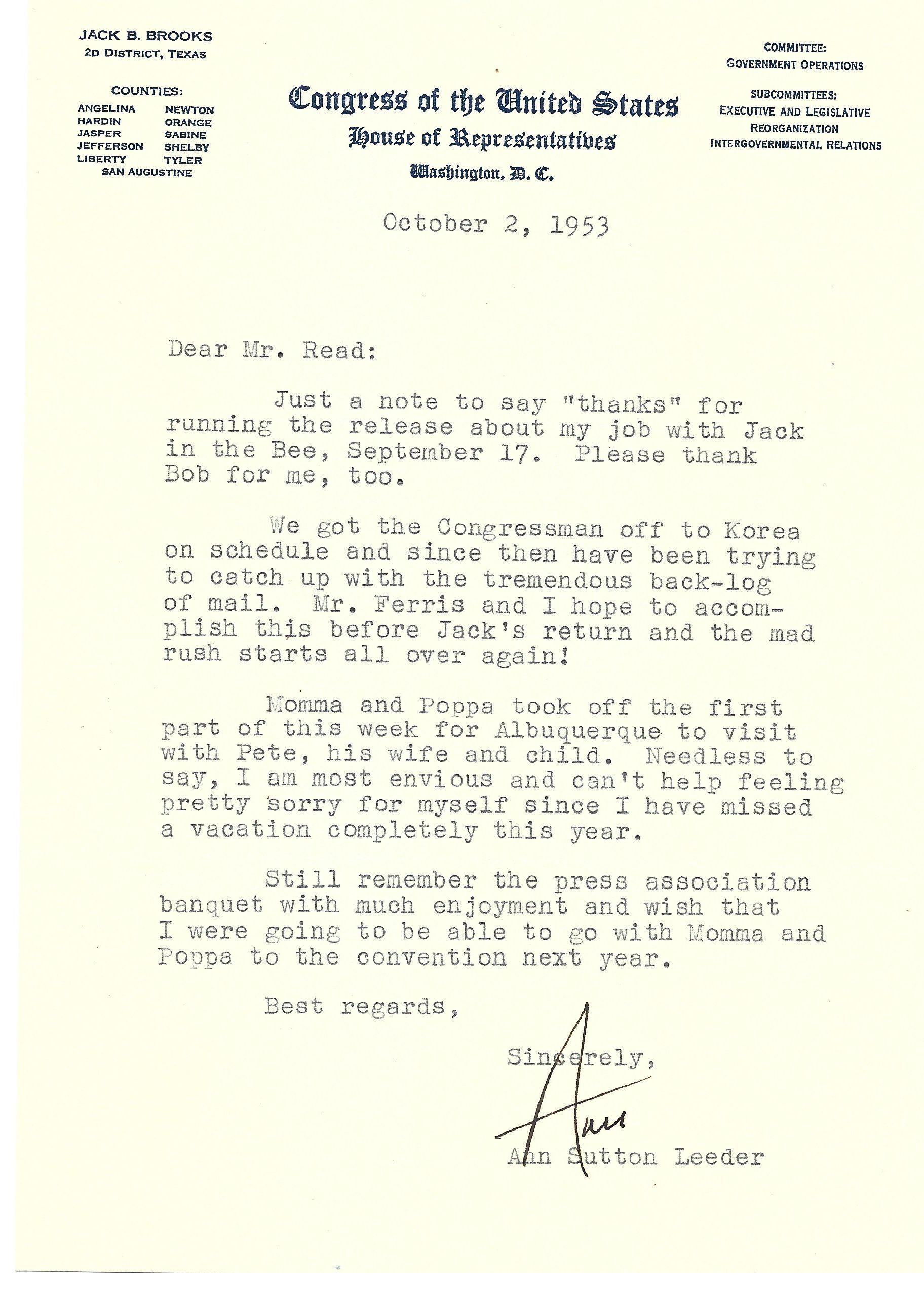 David Read, Jack Brooks, Ann Sutton Leeder, Thank you note, Silsbee BeeCreated By