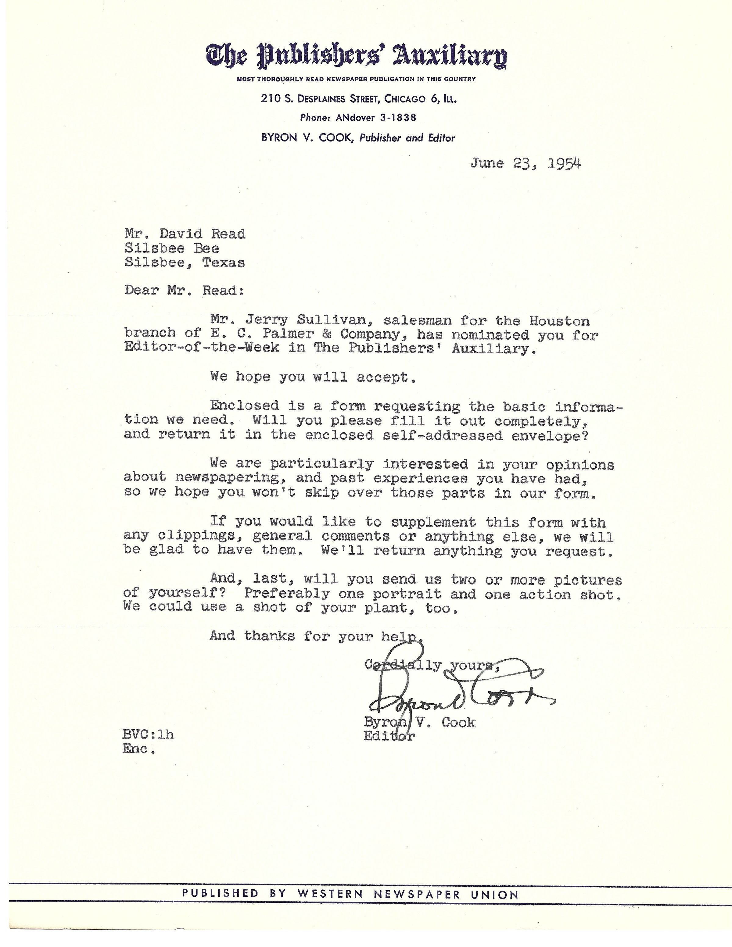 David Read, Byron V Cook, The Pubishers' Auxiliary, Editor of the Week, Silsbee BeeScope and Content