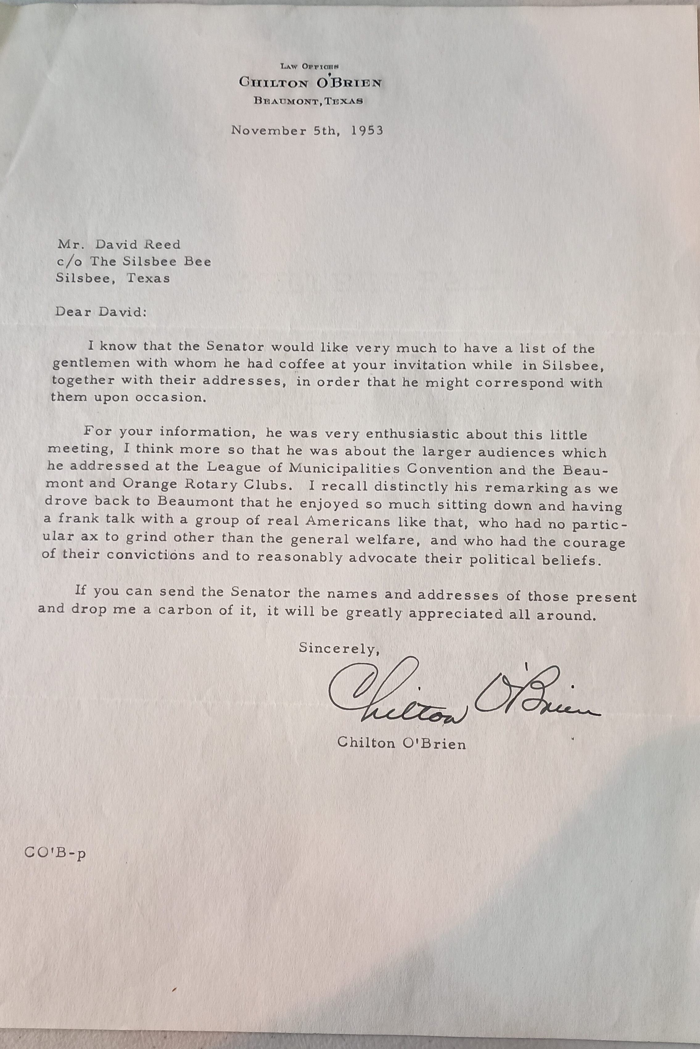 Letter to David Read from Chilton O'Brien, Law Offices of Chilton O'Brien, Beaumont, TX - November 5, 1953 - discussing list of attendees at a meeting with the "Senator"Collection
