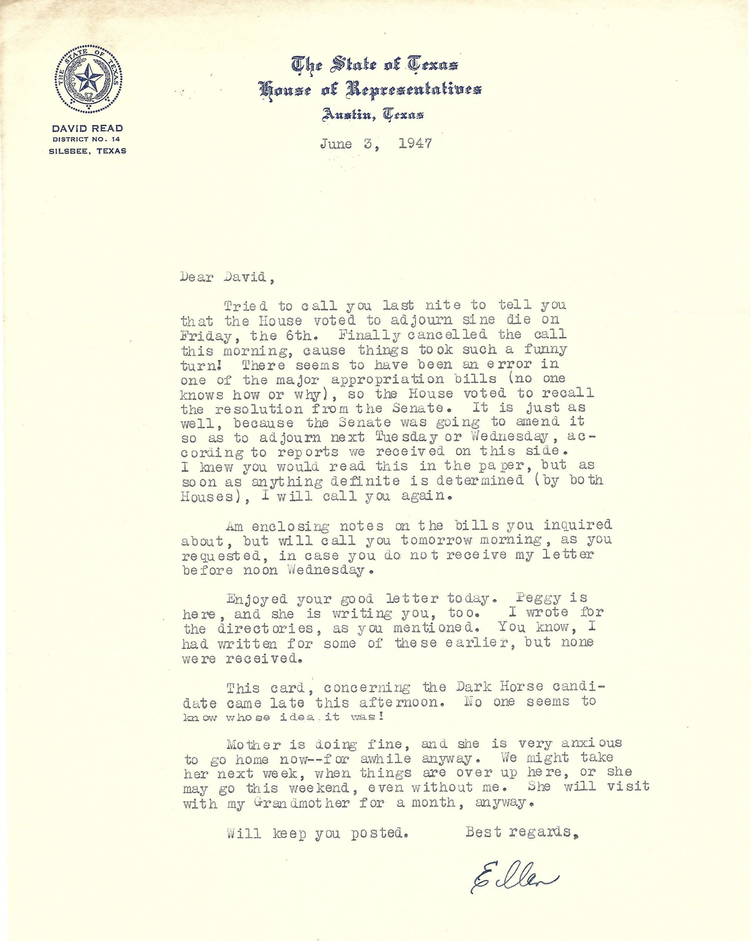 Letter to David Read from Ellen June 3, 1947Tags