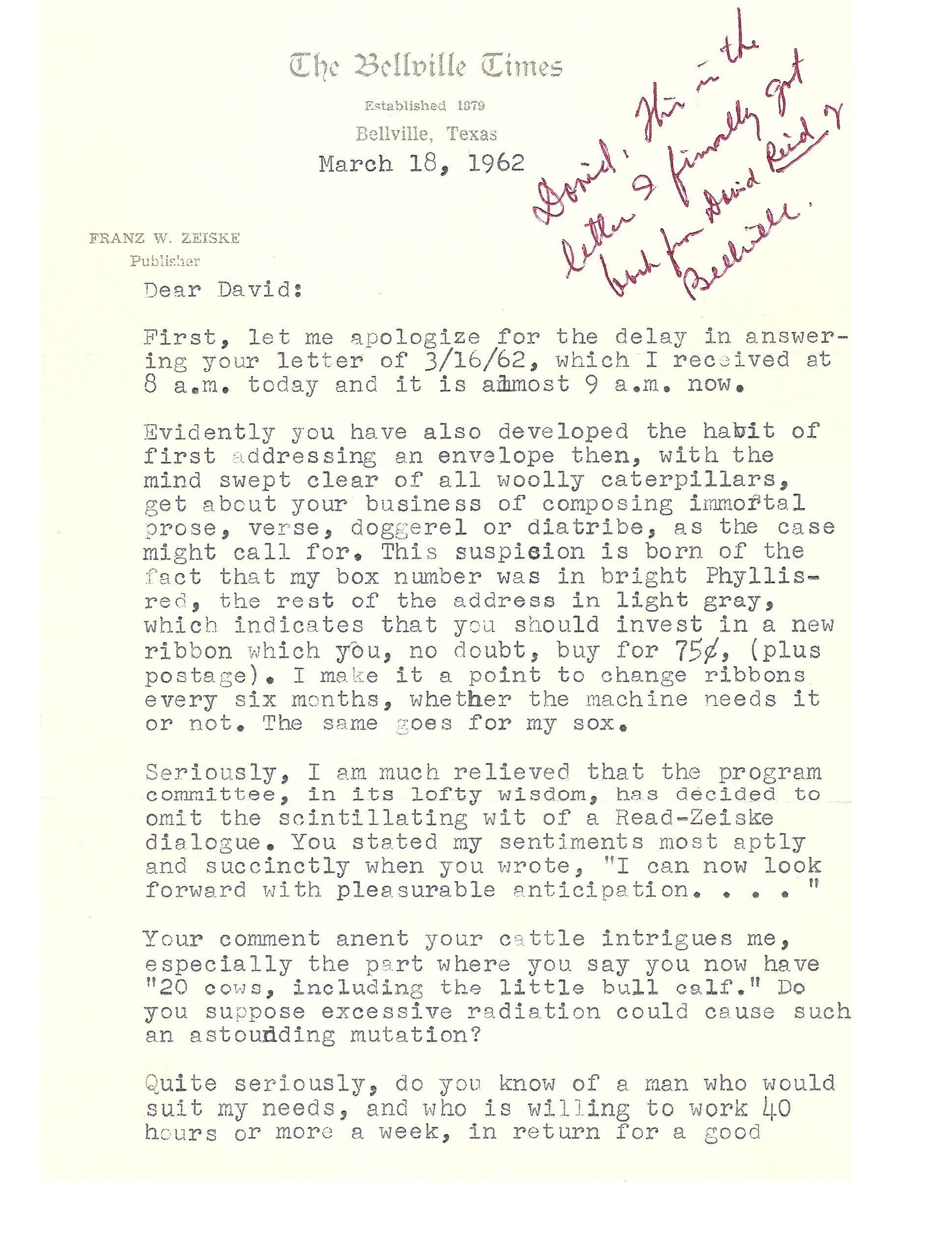 Letter to David Read from Franz W Zeiske March 18, 1962Tags