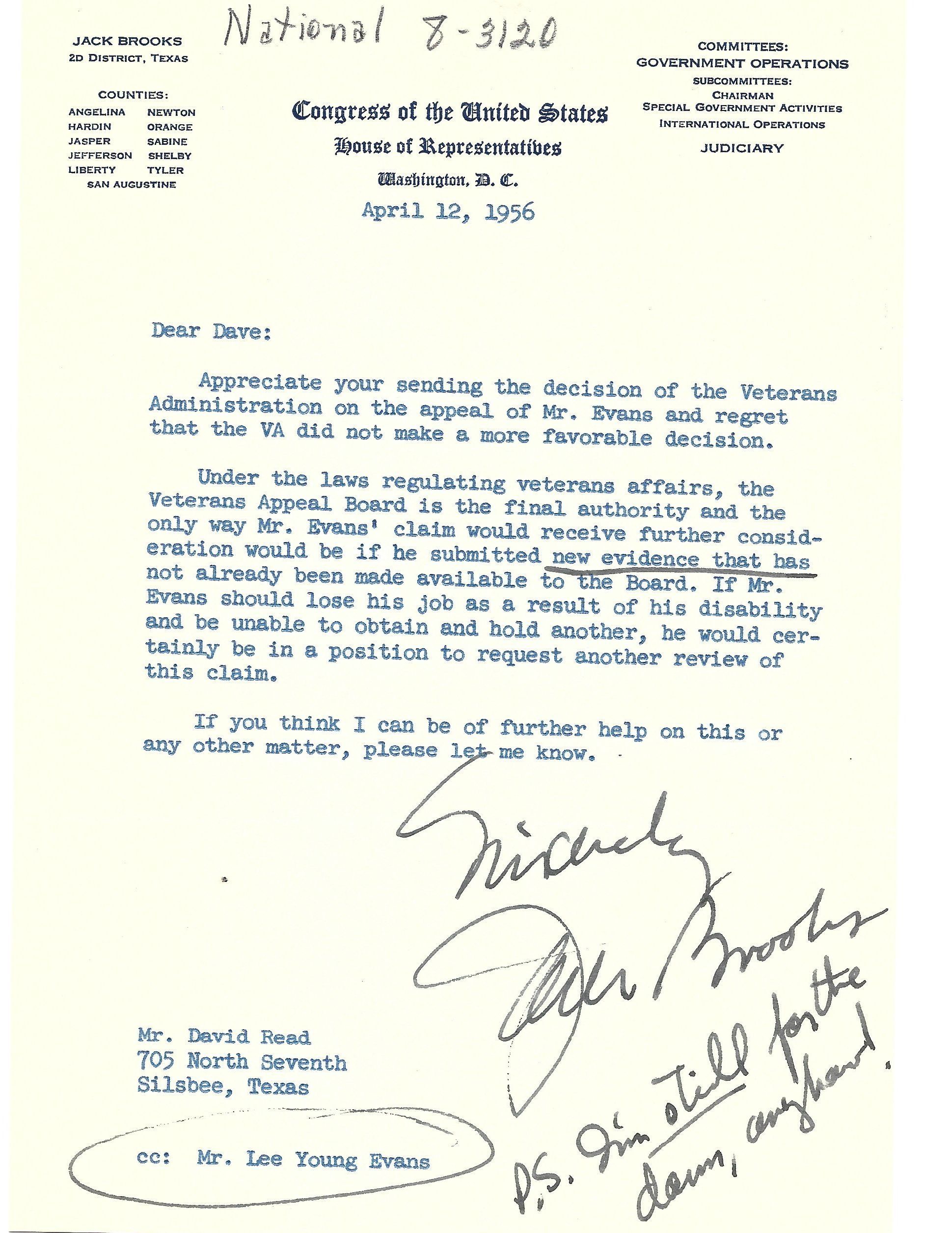 Letter to David Read from Jack Brooks April 12, 1956Tags