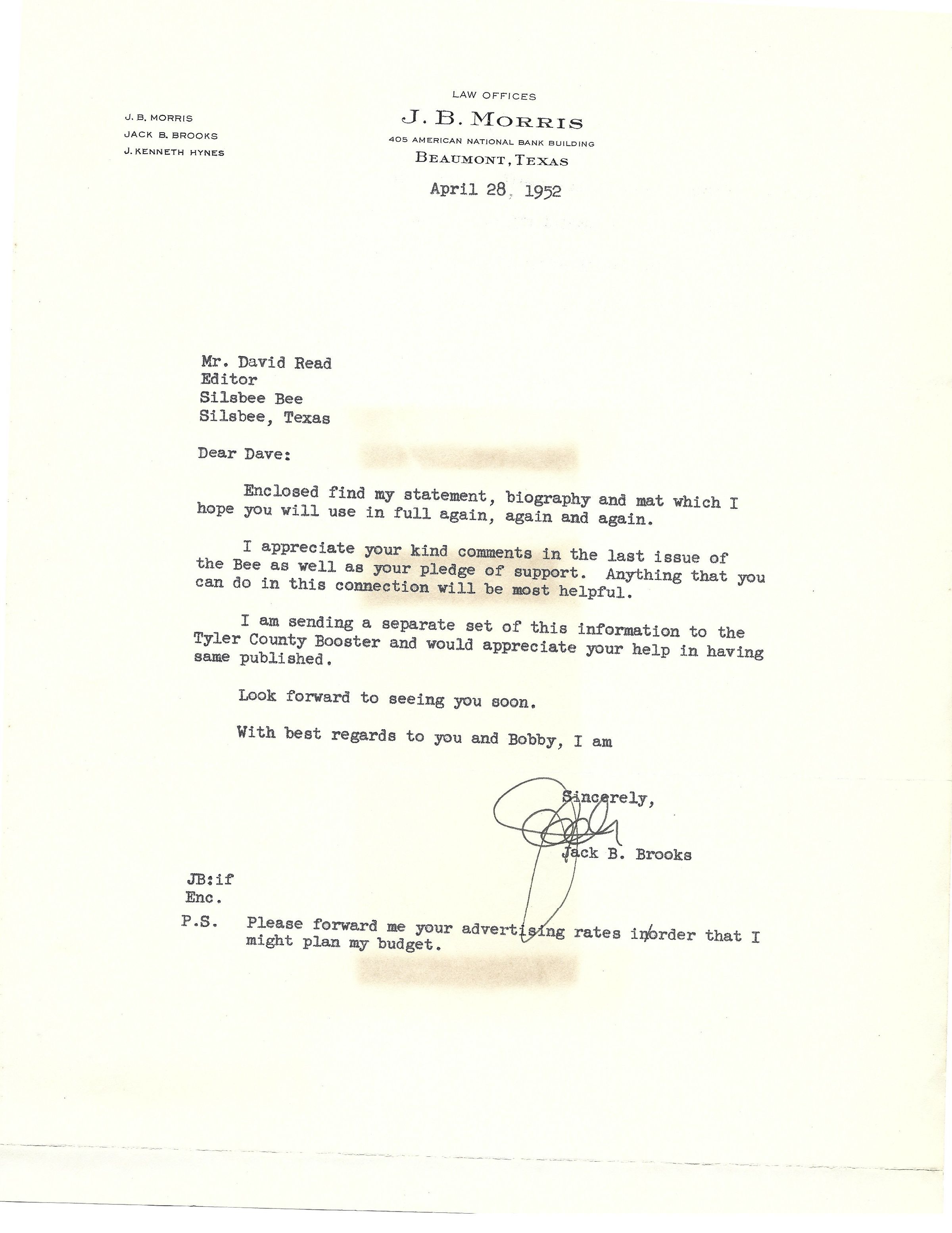 Letter to David Read from Jack Brooks April 28, 1952Tags