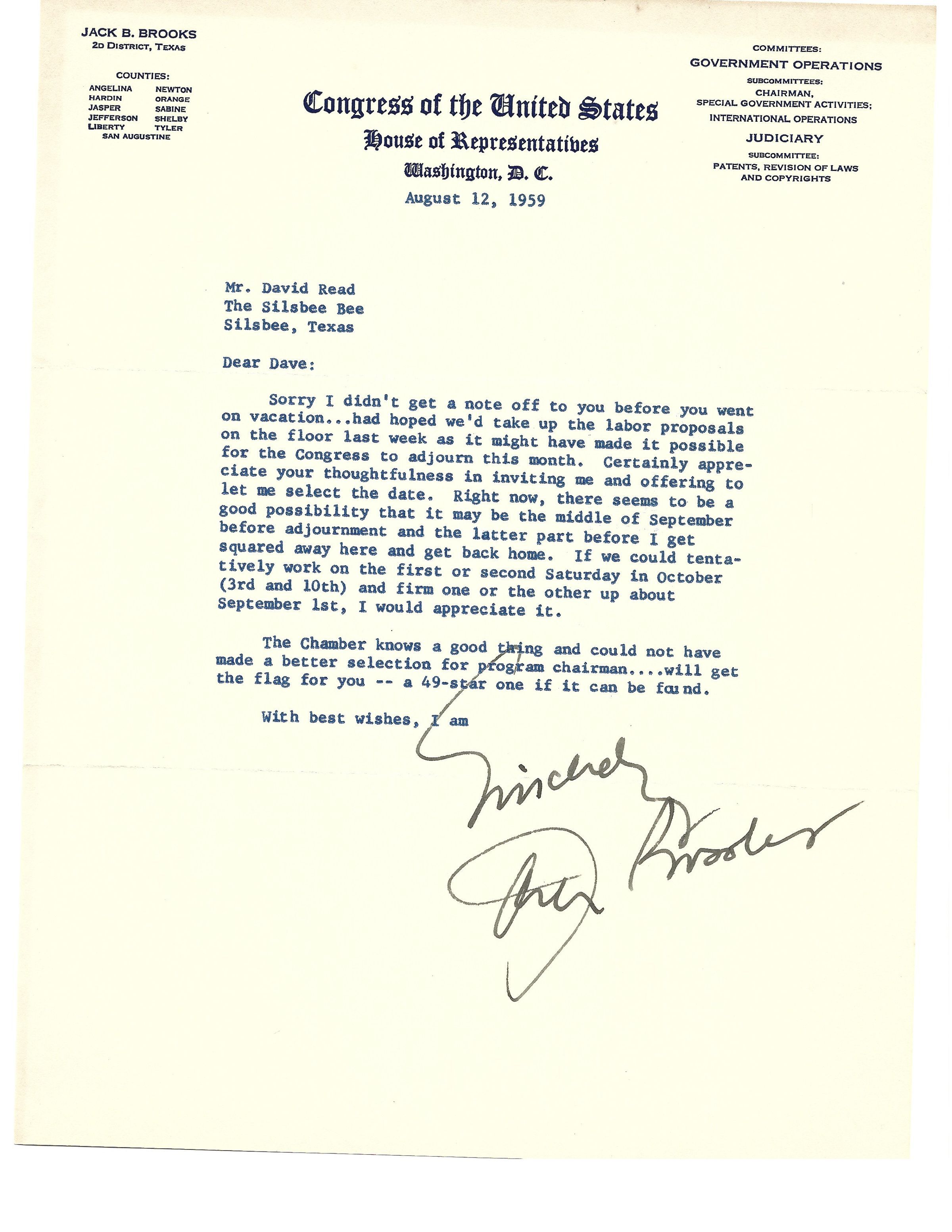 Letter to David Read from Jack Brooks August 12, 1959Tags