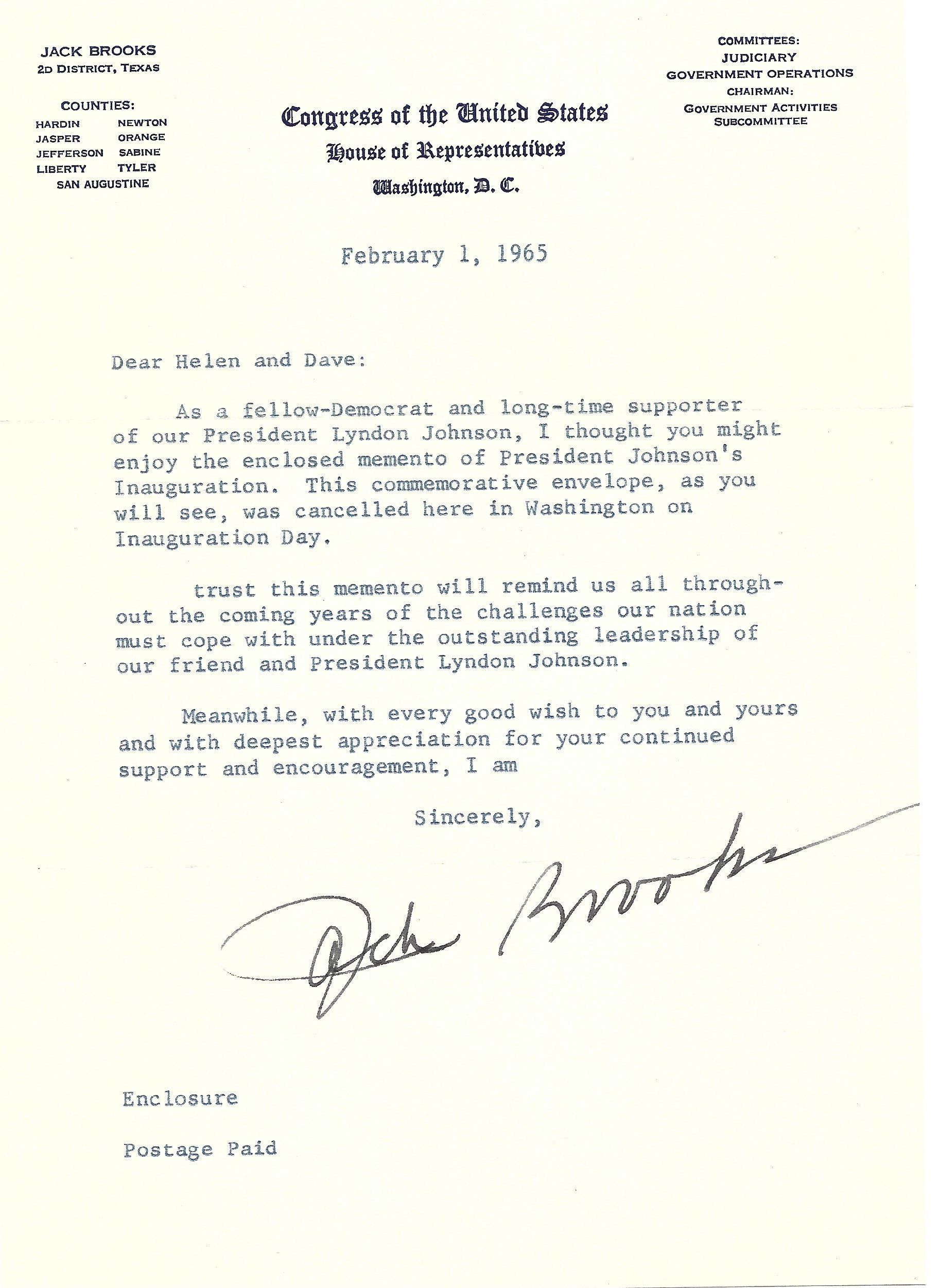 Letter to David Read from Jack Brooks February 1, 1963Tags