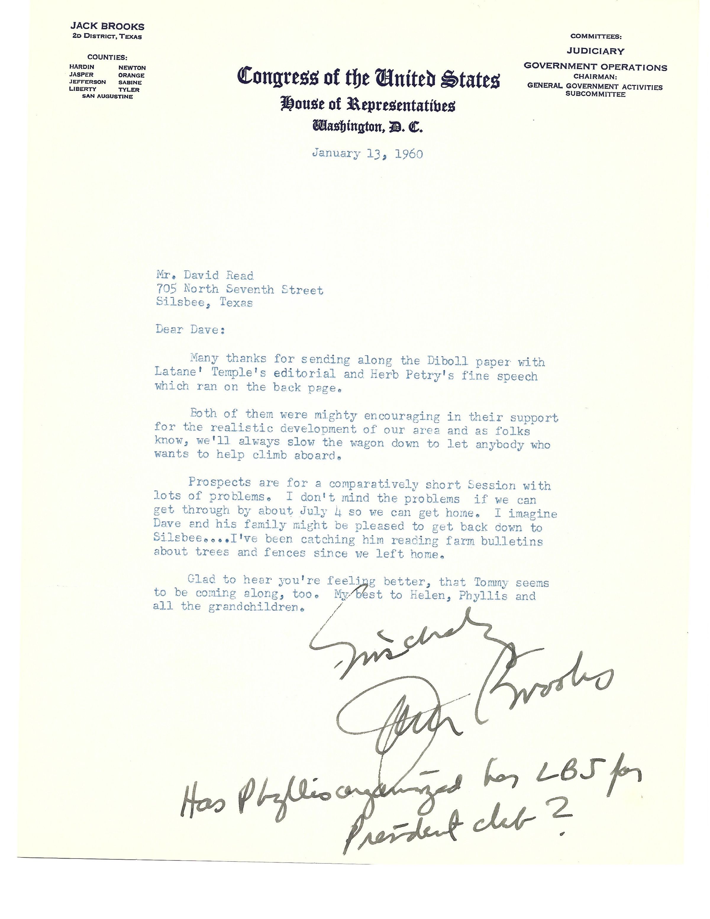 Letter to David Read from Jack Brooks January 13, 1960Tags