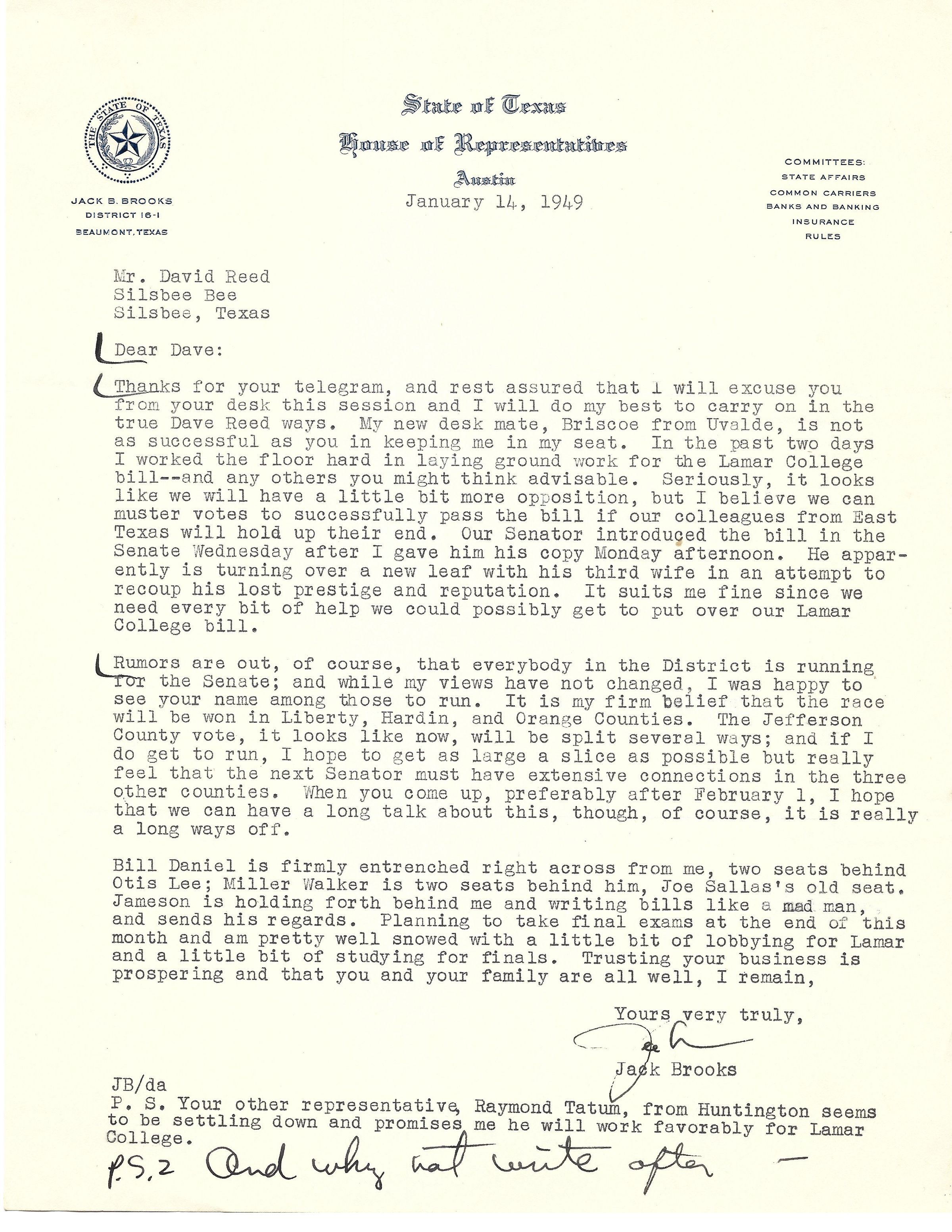 Letter to David Read from Jack Brooks January 14, 1949Tags