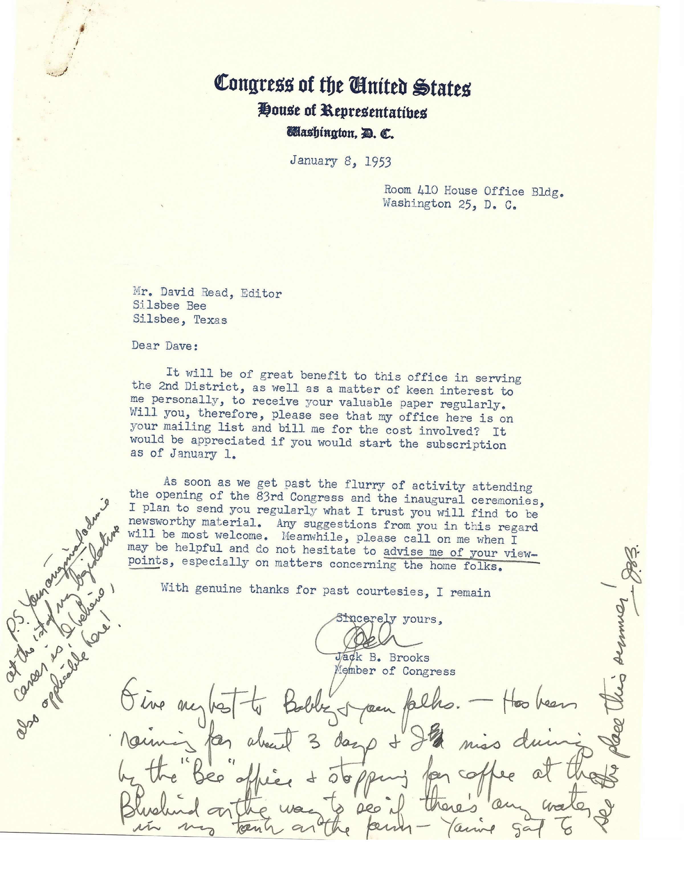 Letter to David Read from Jack Brooks January 8, 1953Tags