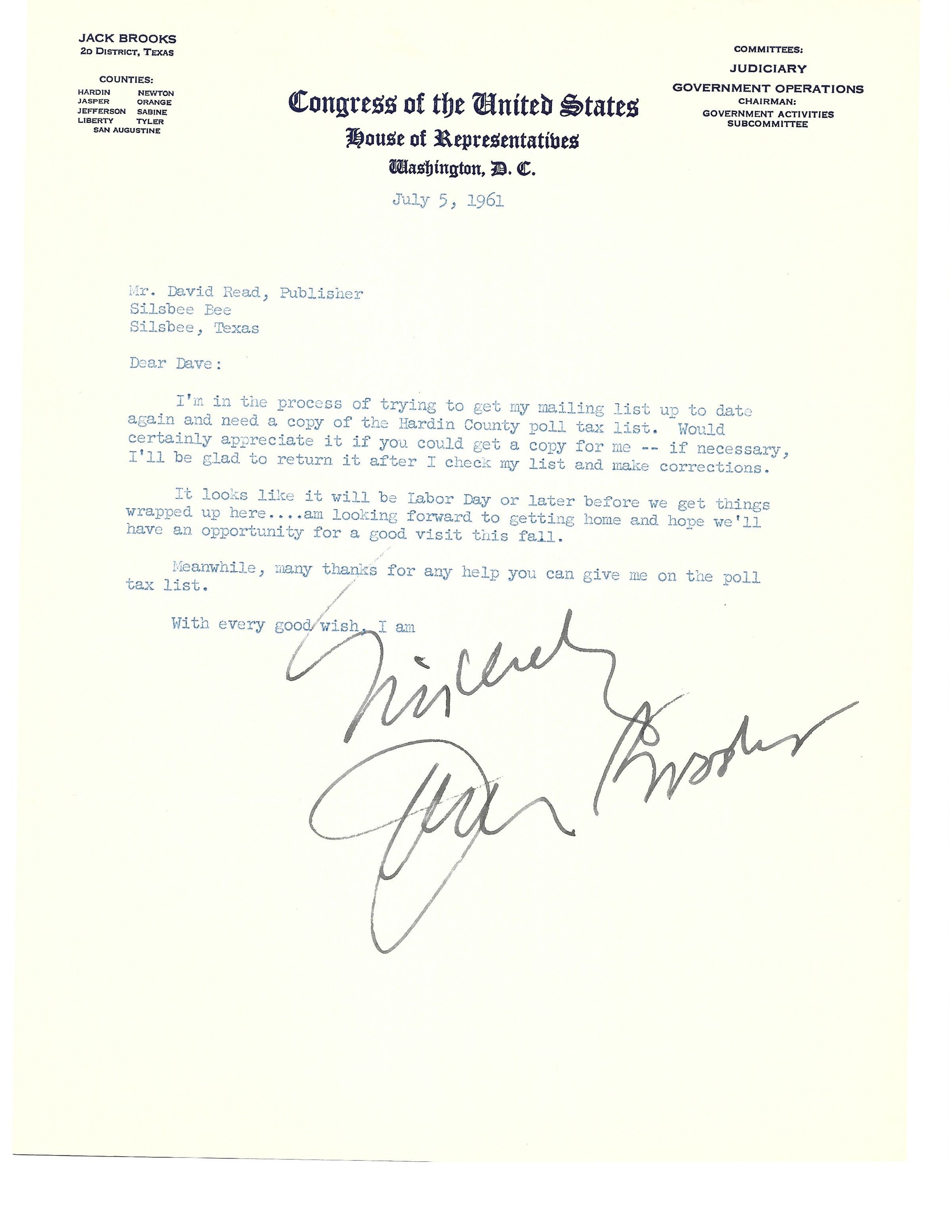 Letter to David Read from Jack Brooks July 5, 1961Tags