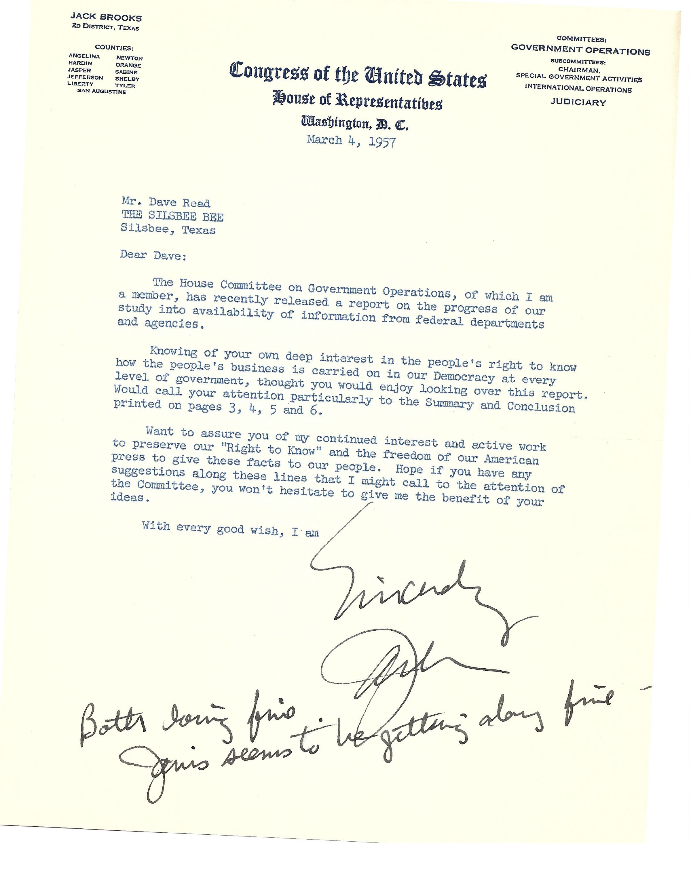 Letter to David Read from Jack Brooks March 1, 1957Tags