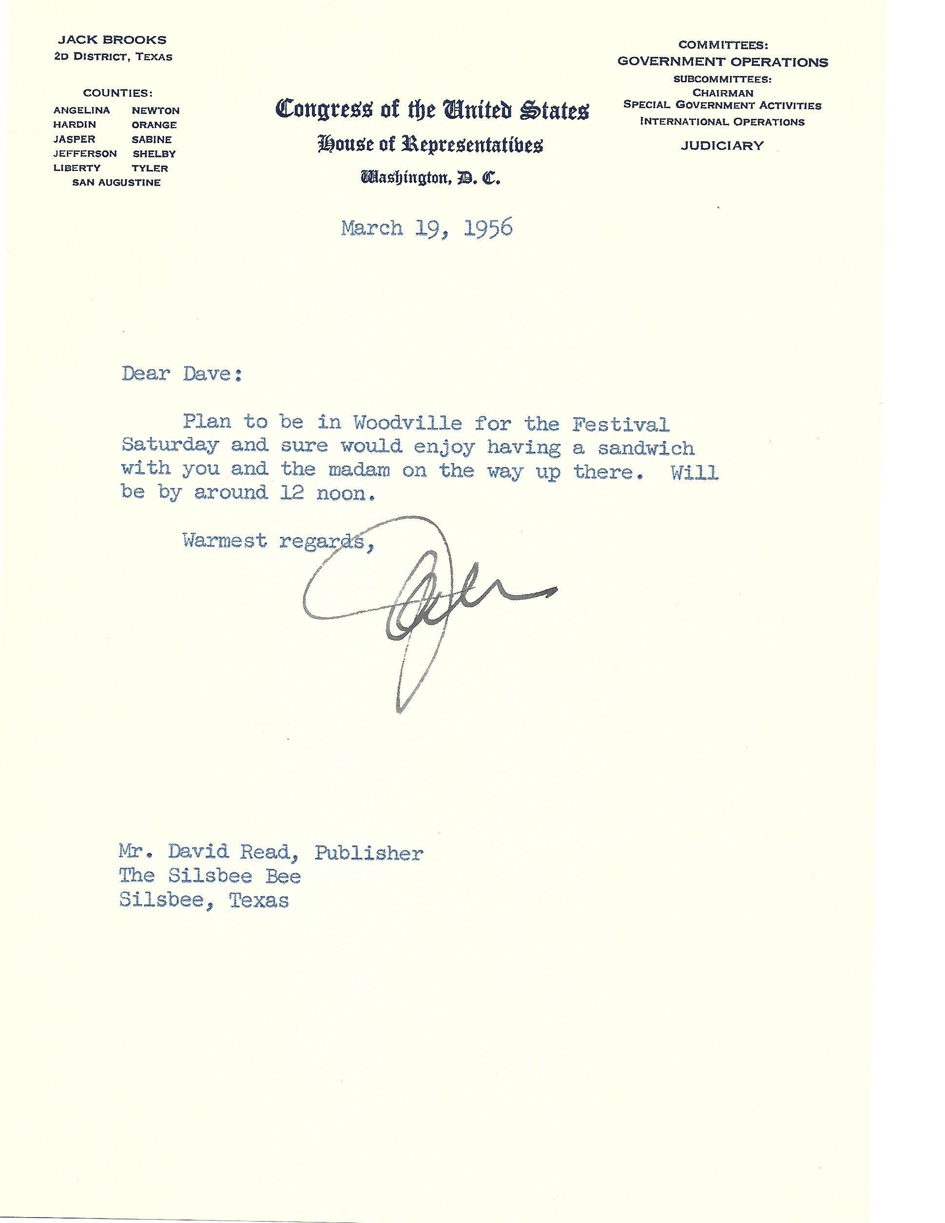Letter to David Read from Jack Brooks March 19, 1956Tags