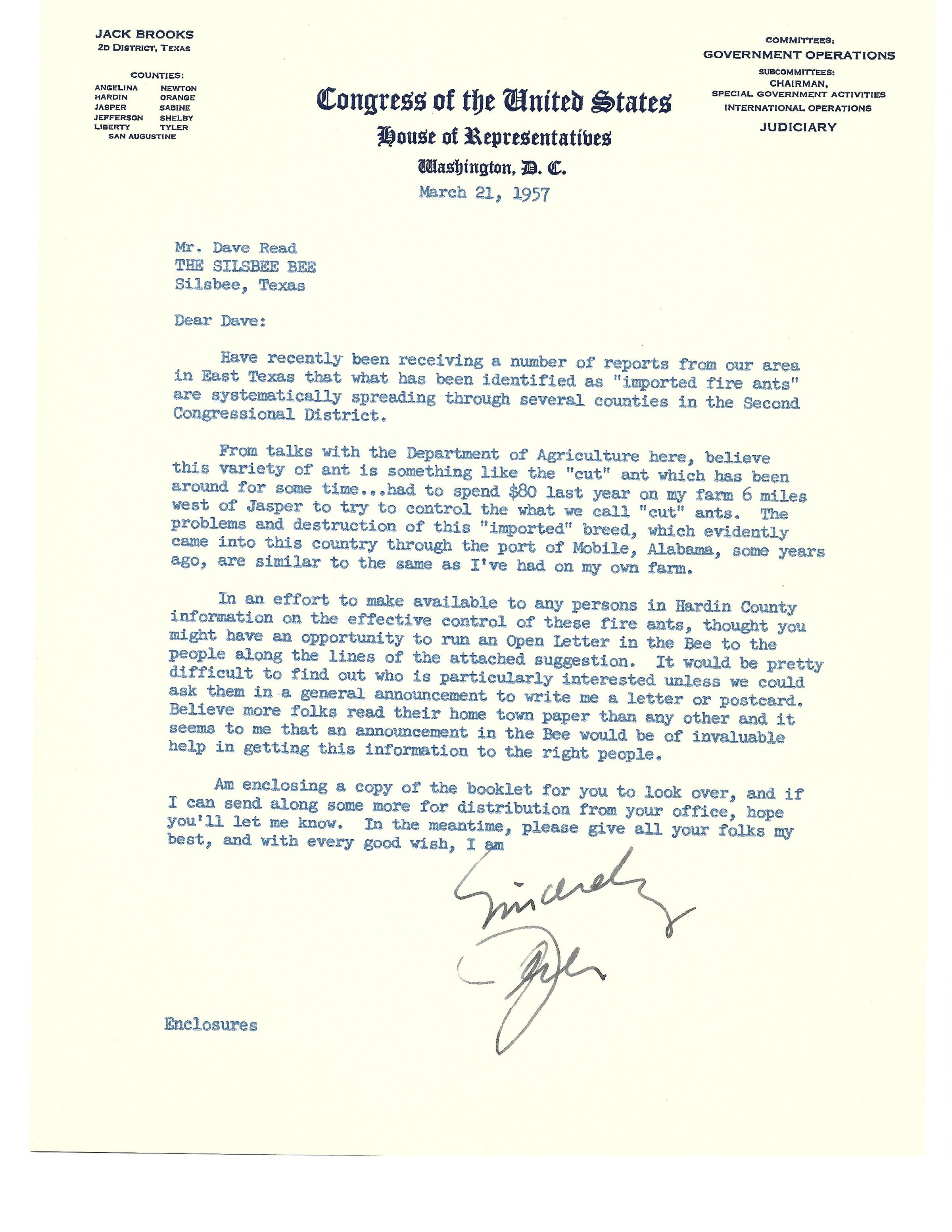 David Read, Jack Brooks, US House of Representatives, Agriculture, Fire Ants, Silsbee BeeCreated By