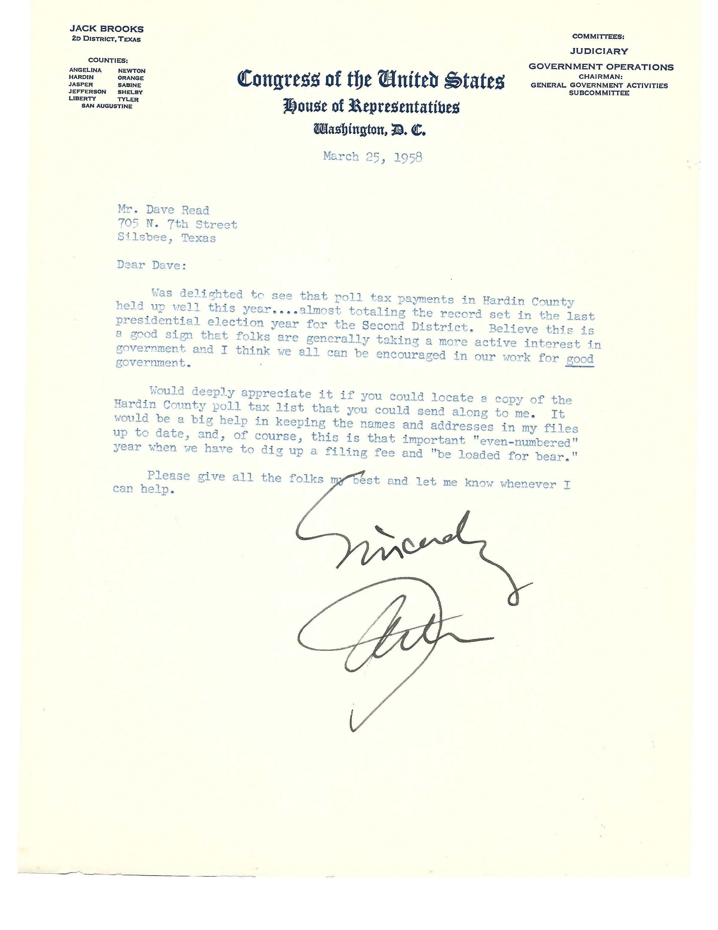 Letter to David Read from Jack Brooks March 25, 1958Tags
