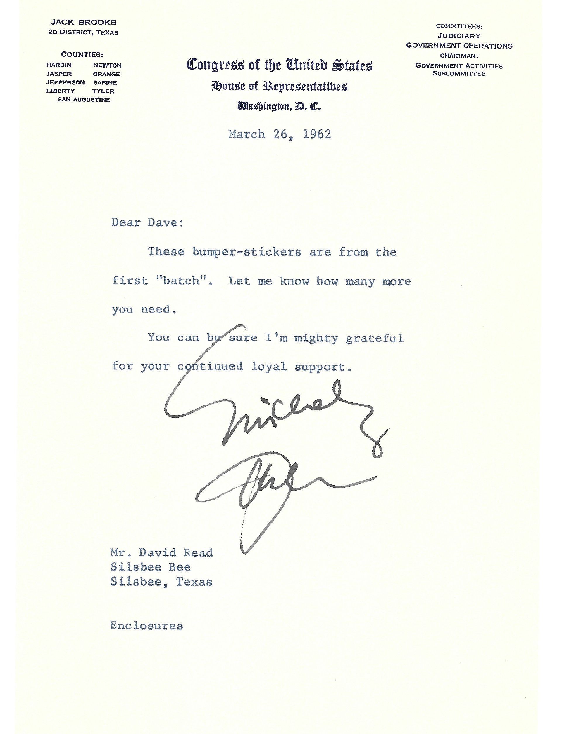 Letter to David Read from Jack Brooks March 26, 1962Tags