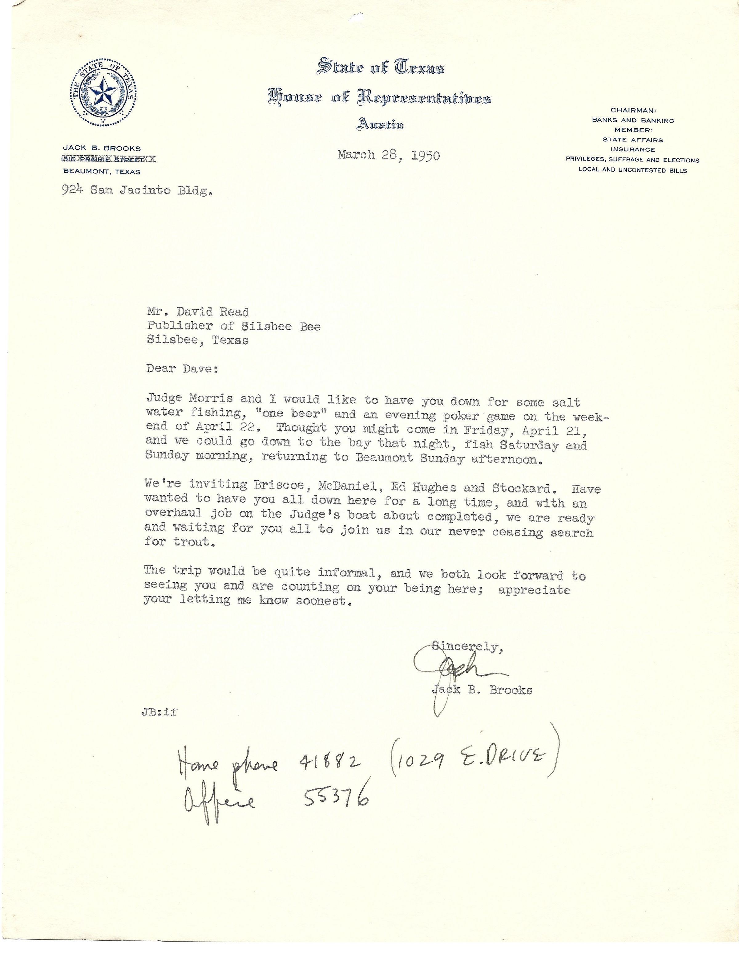 Letter to David Read from Jack Brooks March 28, 1950Tags