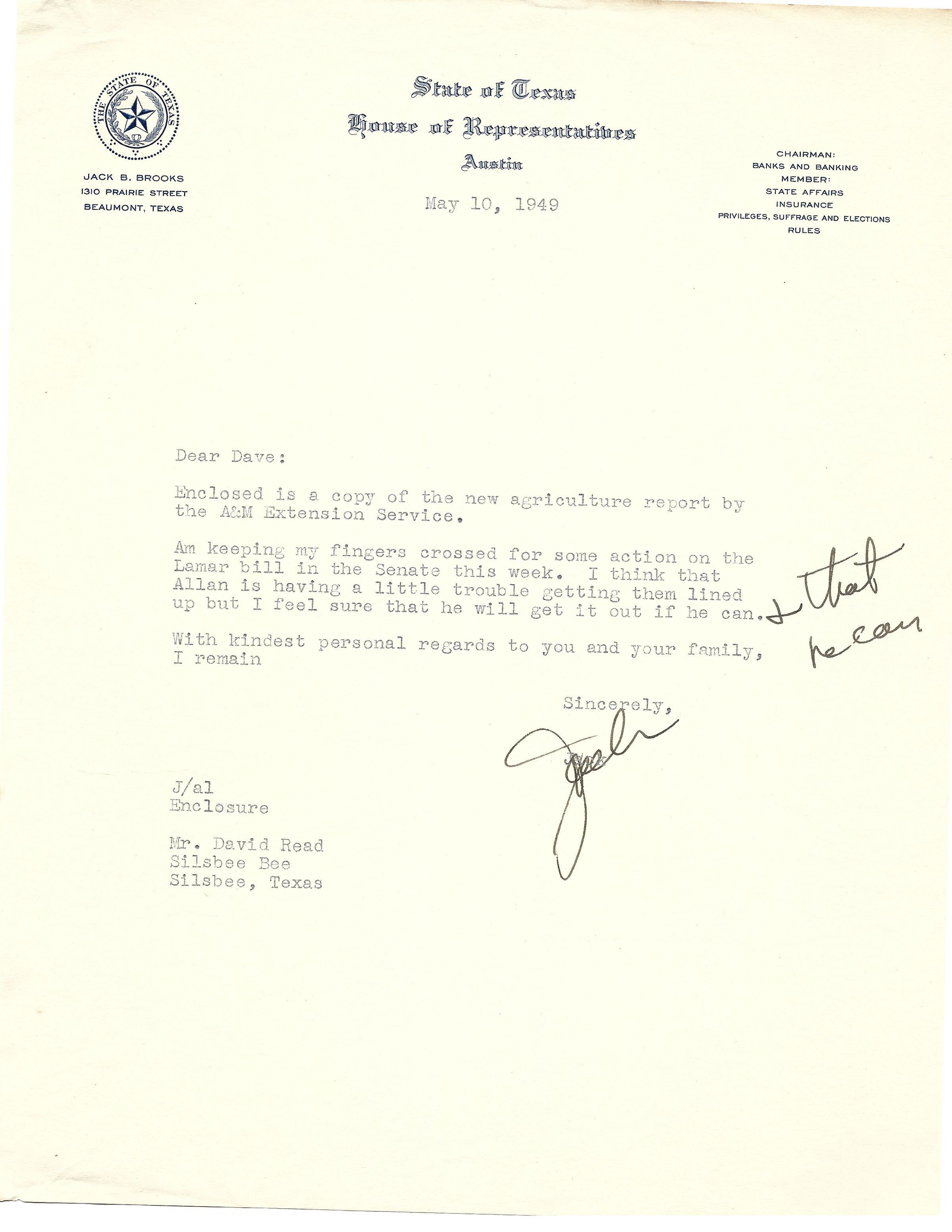 Letter to David Read from Jack Brooks May 10, 1949Tags