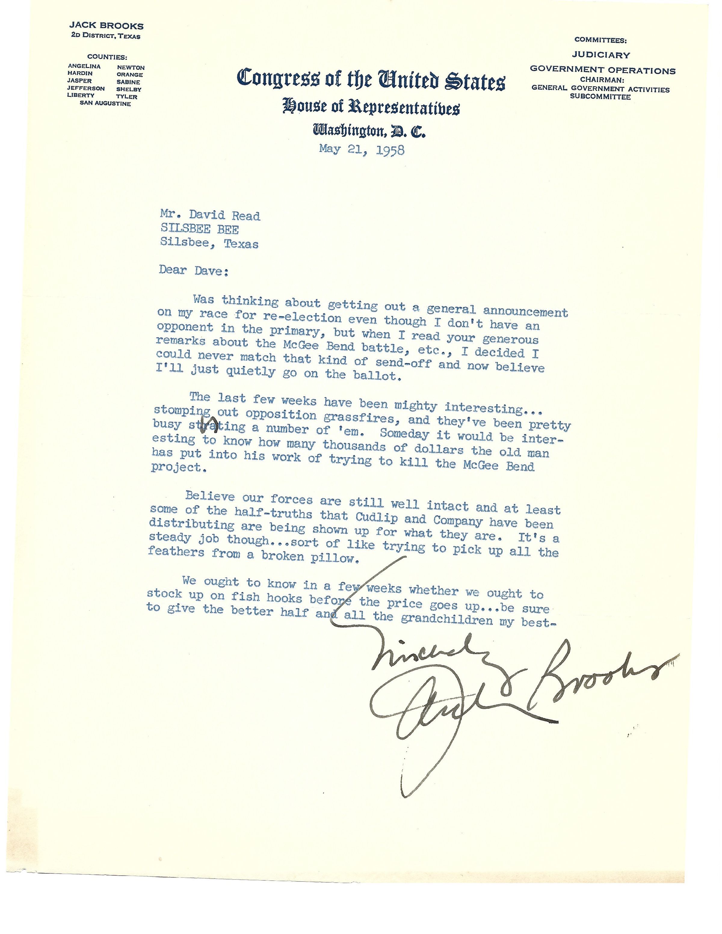 Letter to David Read from Jack Brooks May 21, 1958Tags