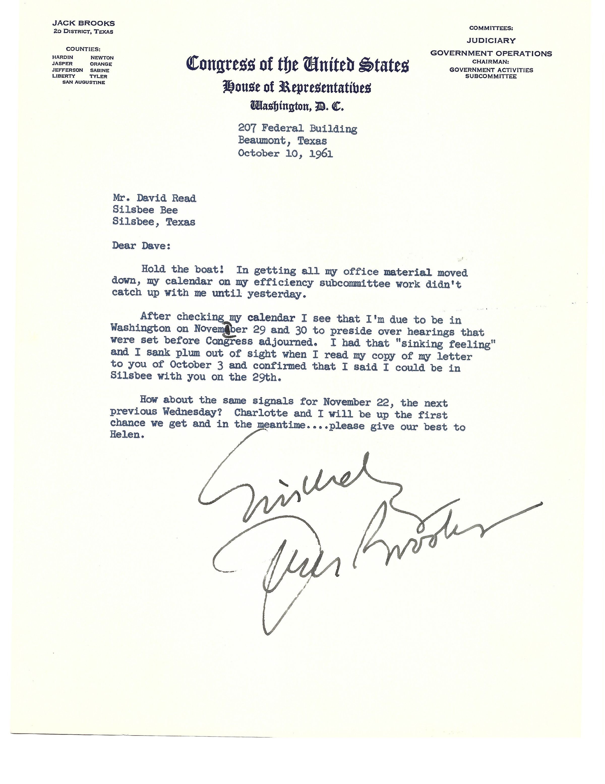 Letter to David Read from Jack Brooks October 10, 1961Tags