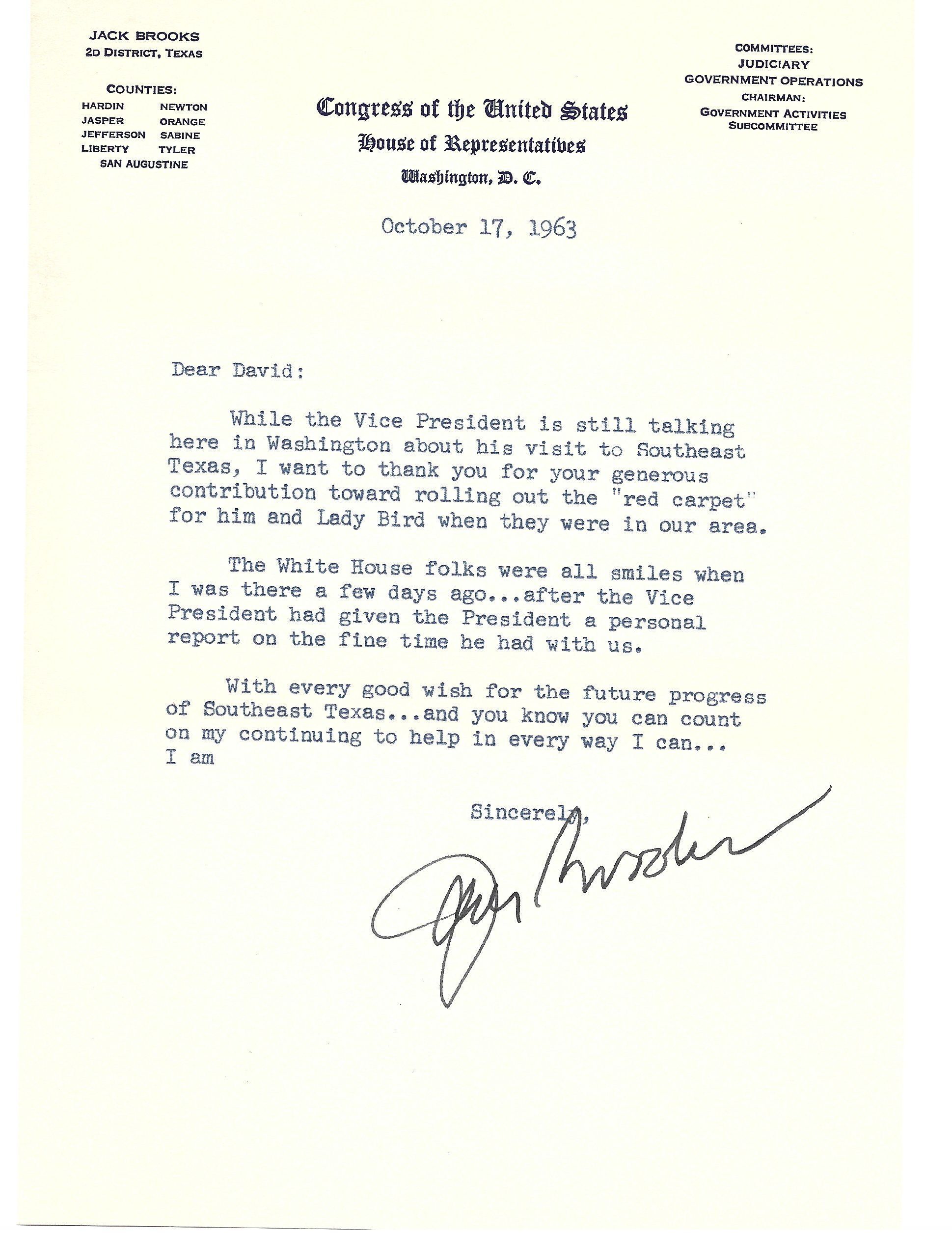 Letter to David Read from Jack Brooks October 17, 1963Tags