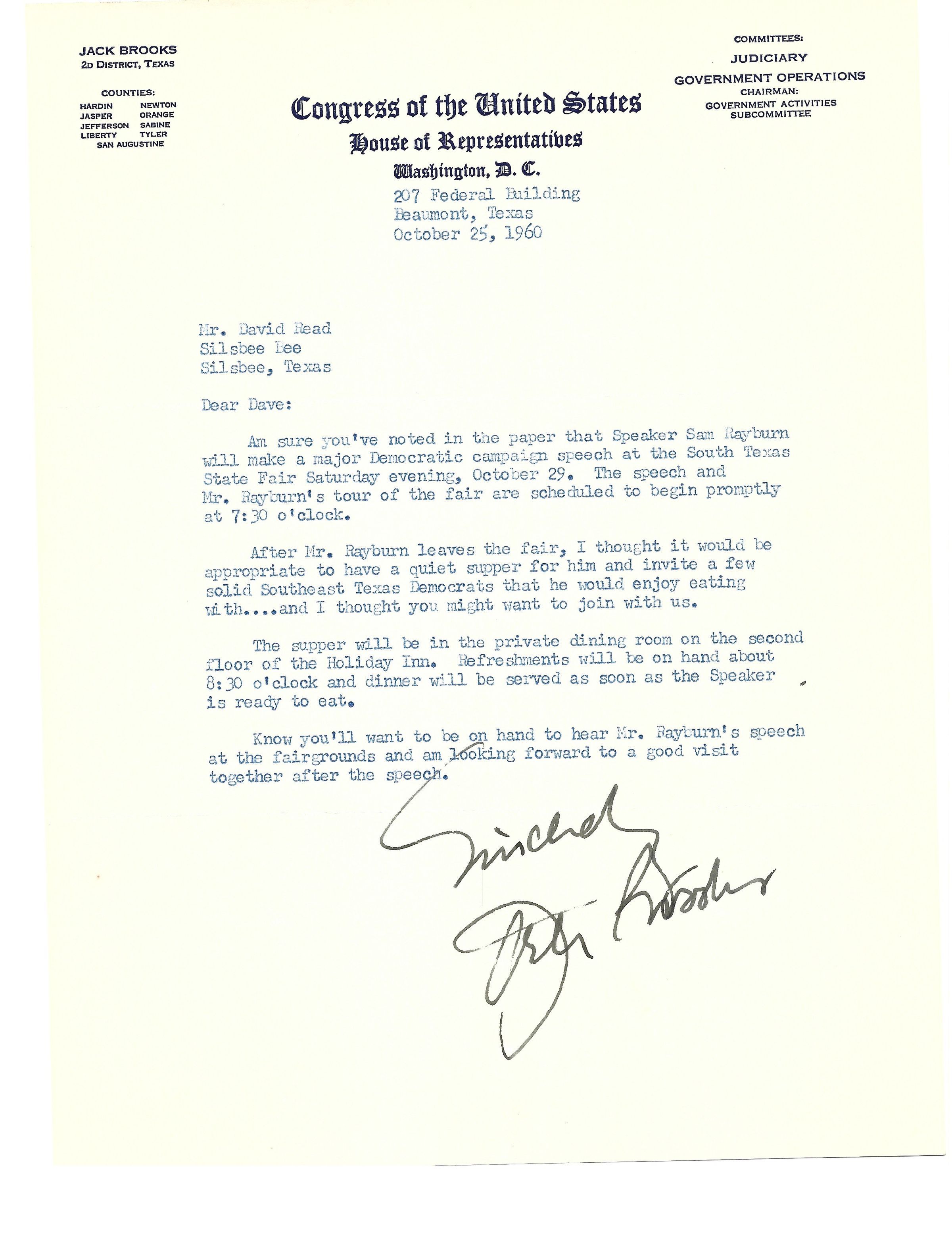 Letter to David Read from Jack Brooks October 25, 1960Tags