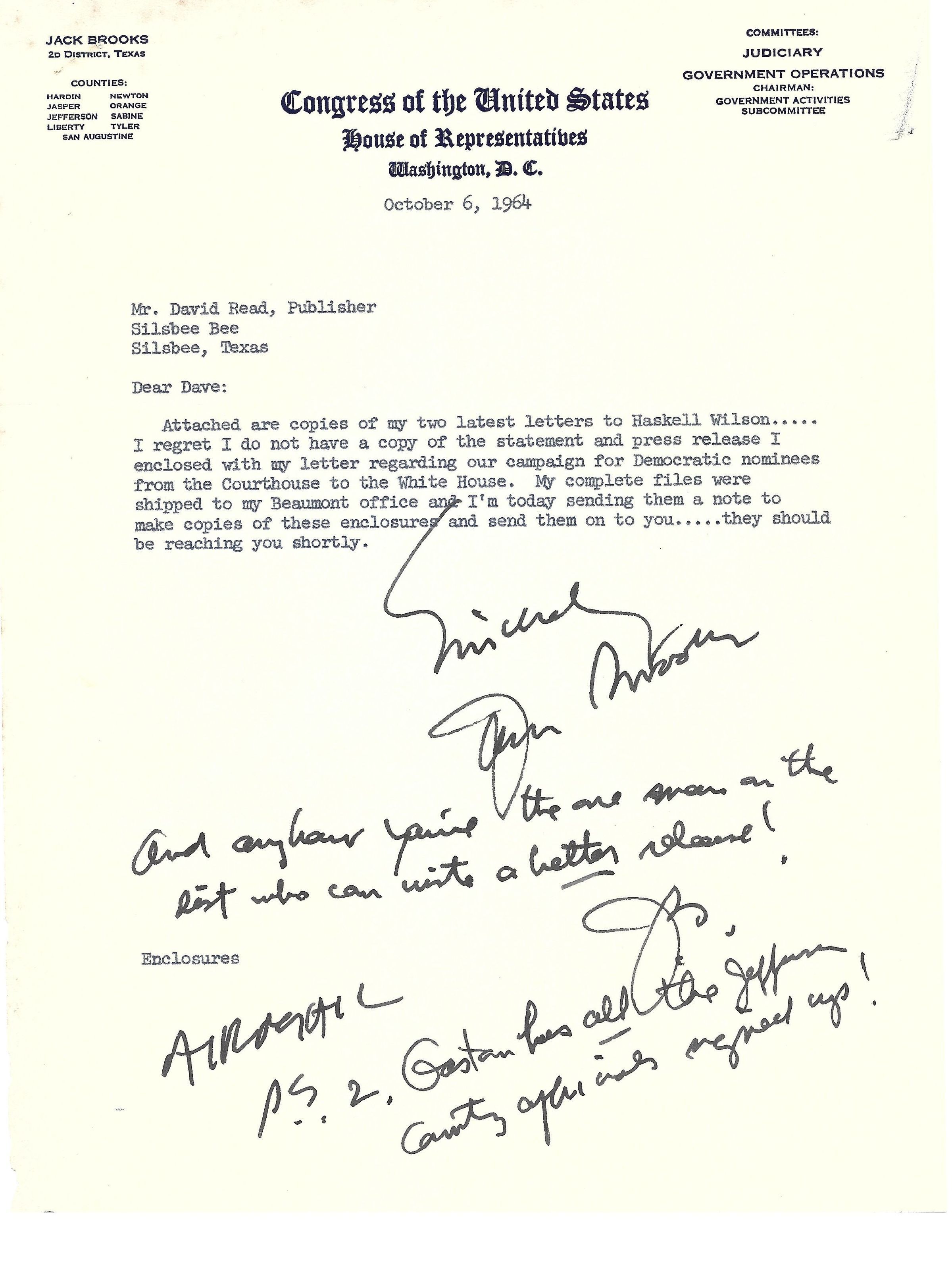 Letter to David Read from Jack Brooks October 6, 1964 with 2 enclosed copies of letters to Haskell WilsonTags