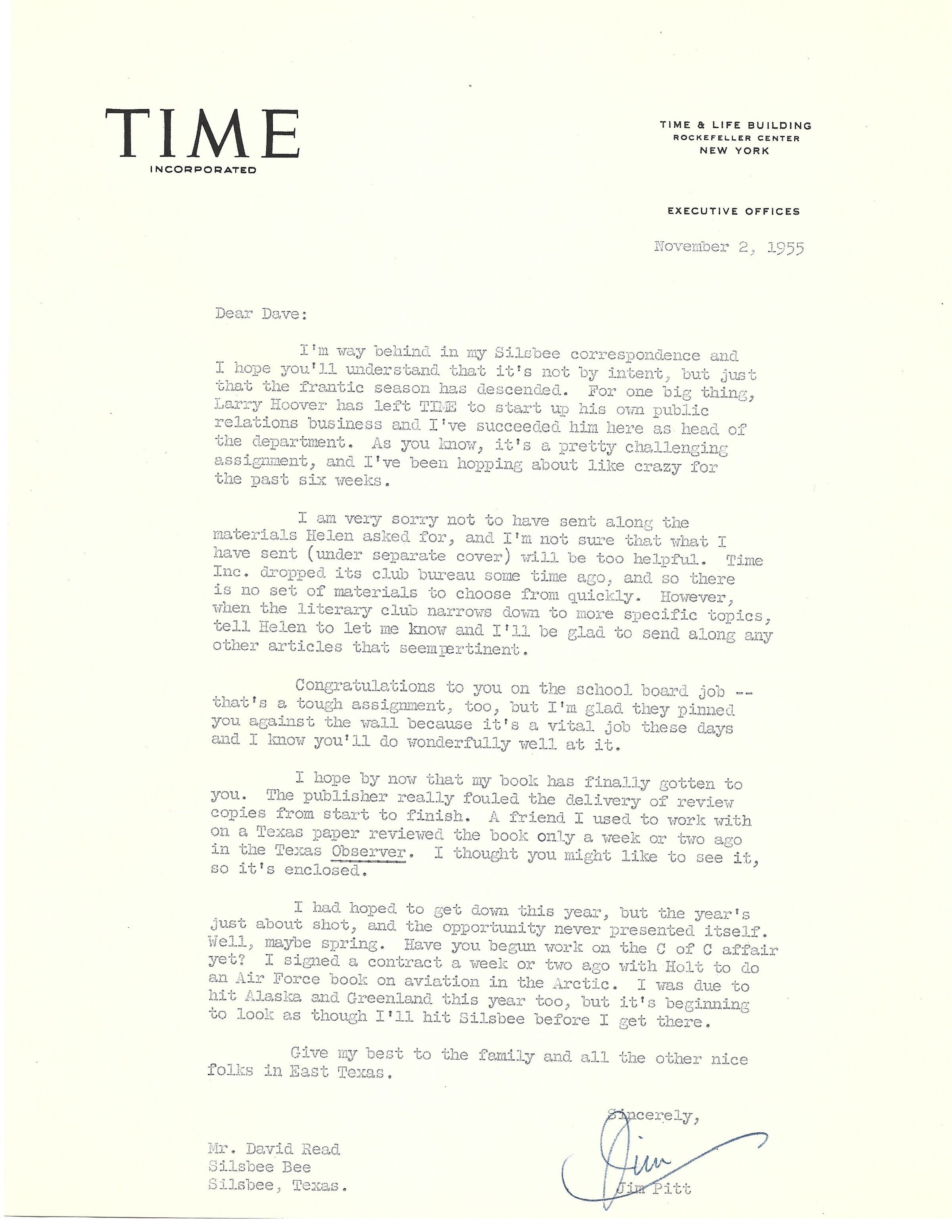 Letter to David Read from Jim Pitt - Times Inc November 2, 1955Tags