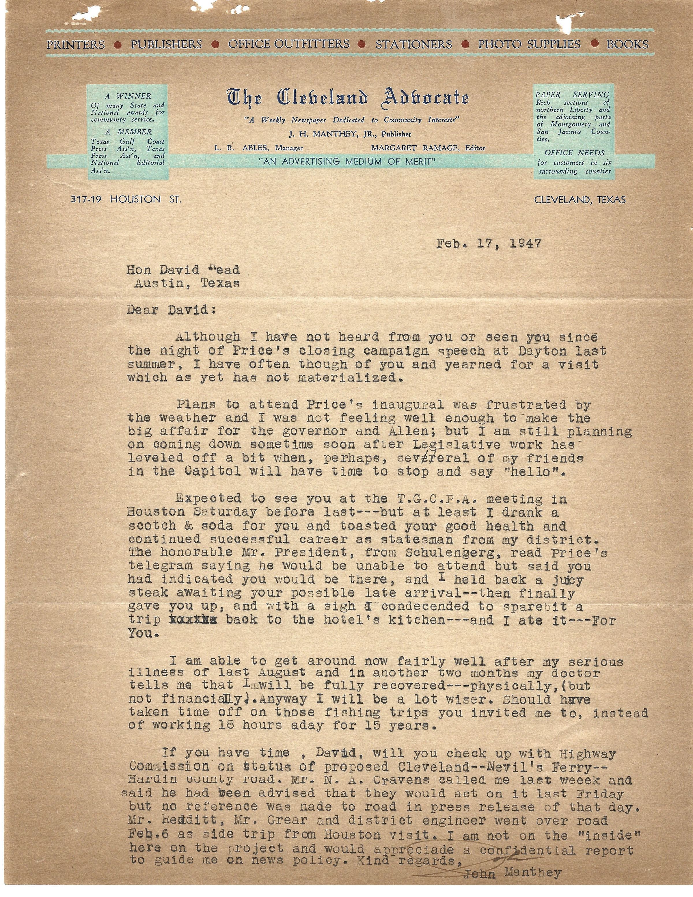 Letter to David Read from John Manthey Jr February 17, 1947Tags