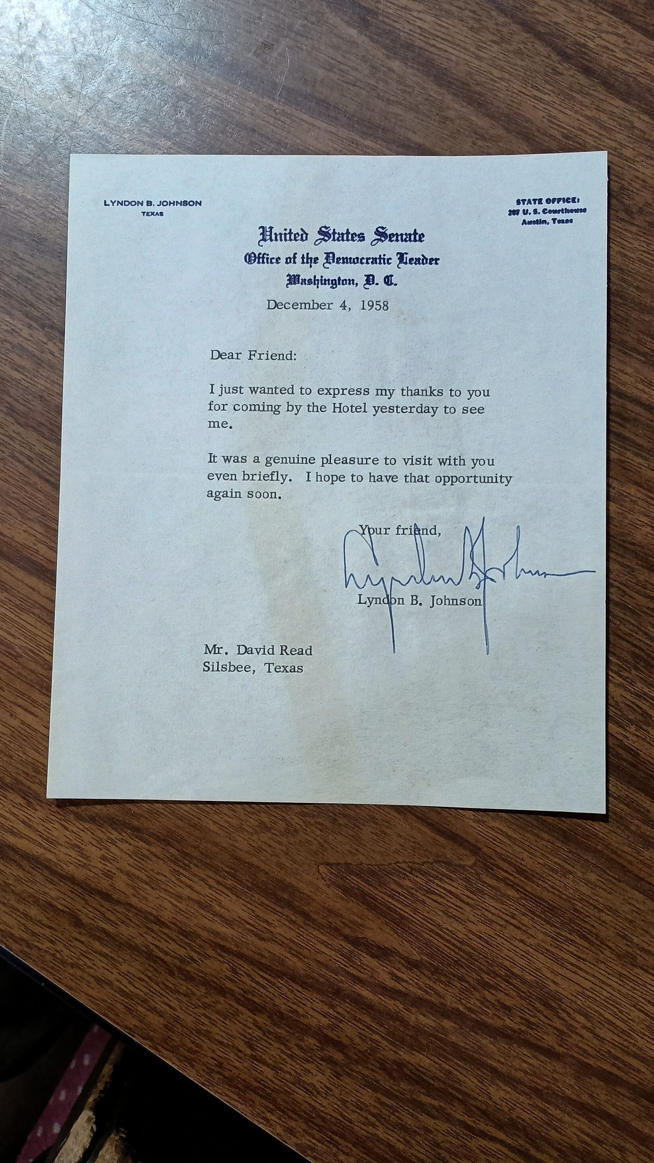Letter to David Read from Lyndon B Johnson dated December 4, 1958 thanking David for his recent visit at the hotel in Washington DCCollection