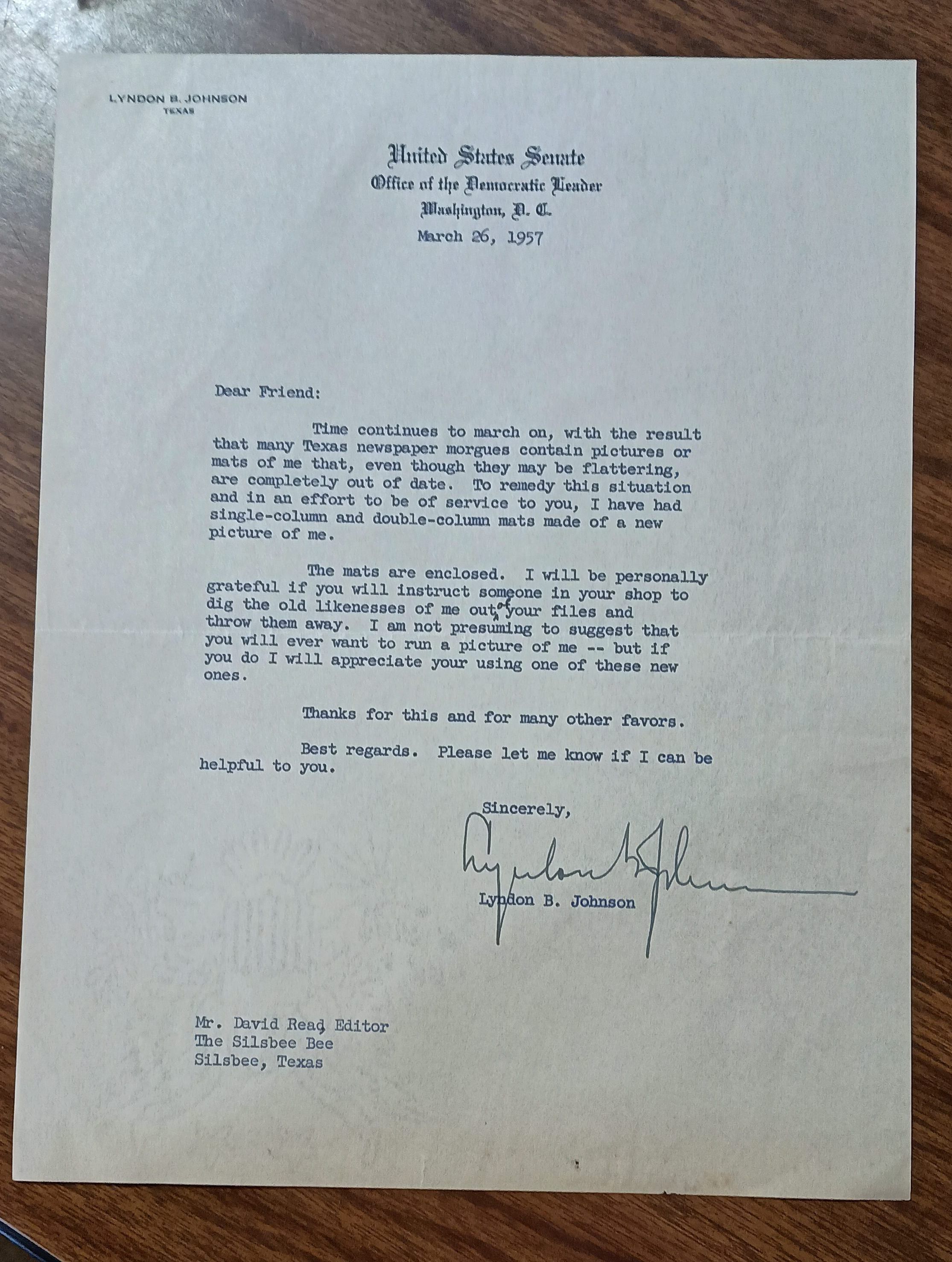 Letter to David Read from Lyndon B Johnson dated March 26, 1957 sending him current mats or pictures to be used should Read think it necessaryCollection