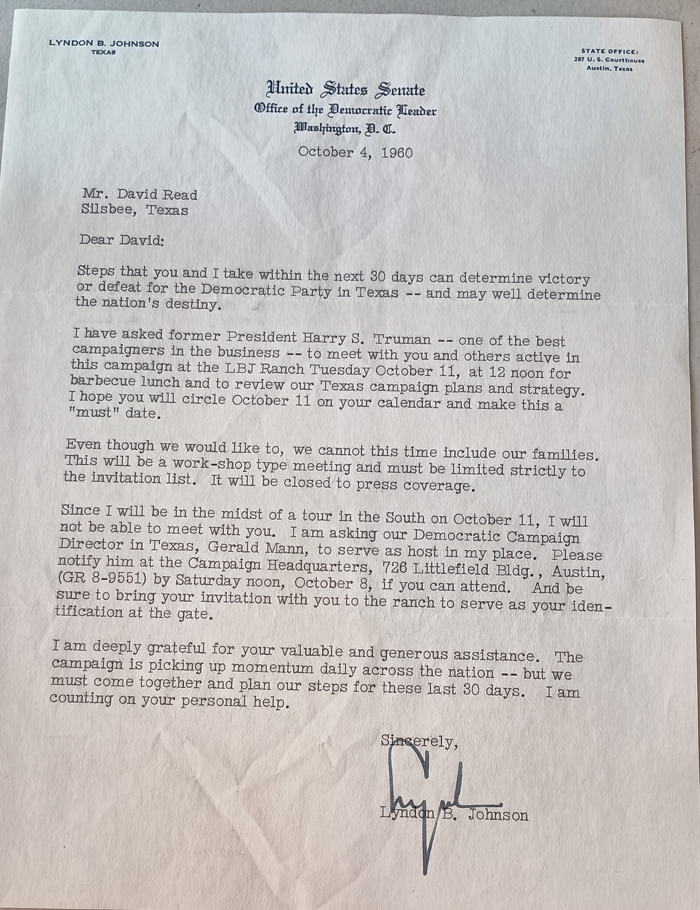 Letter to David Read from LBJ as a US Senator - October 4, 1960 - discussing victory or defeat within the next 30 days for the Democratic Party in TexasCollection
