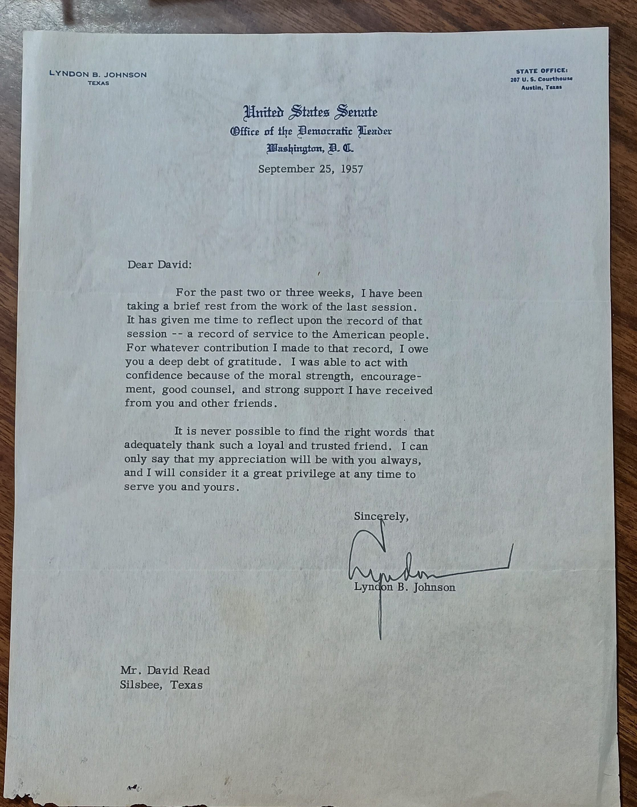 Letter to David Read from Lyndon B Johnson dated September 25, 1957 expressing a debt of gratitudeCollection