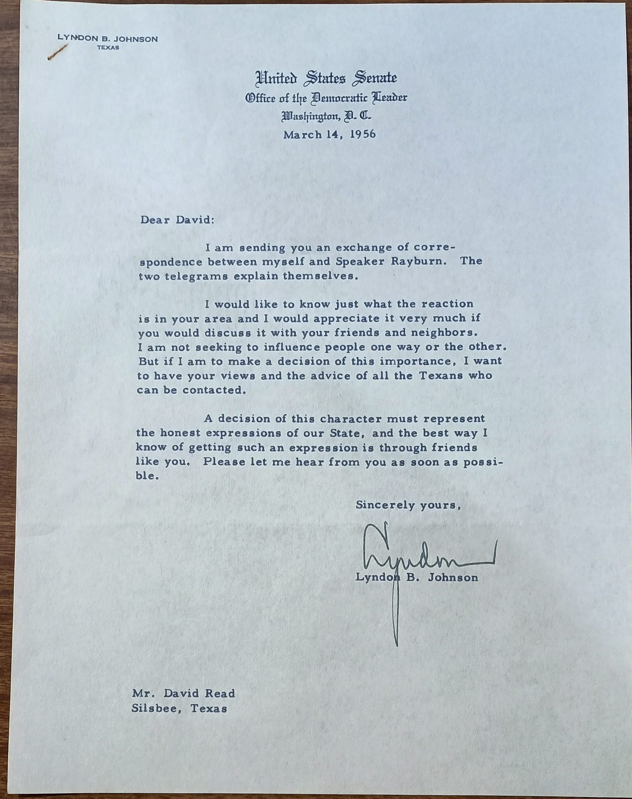Letter to David Read from Lyndon B Johnson dates March 14, 1956Tags
